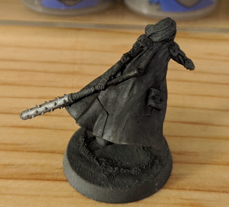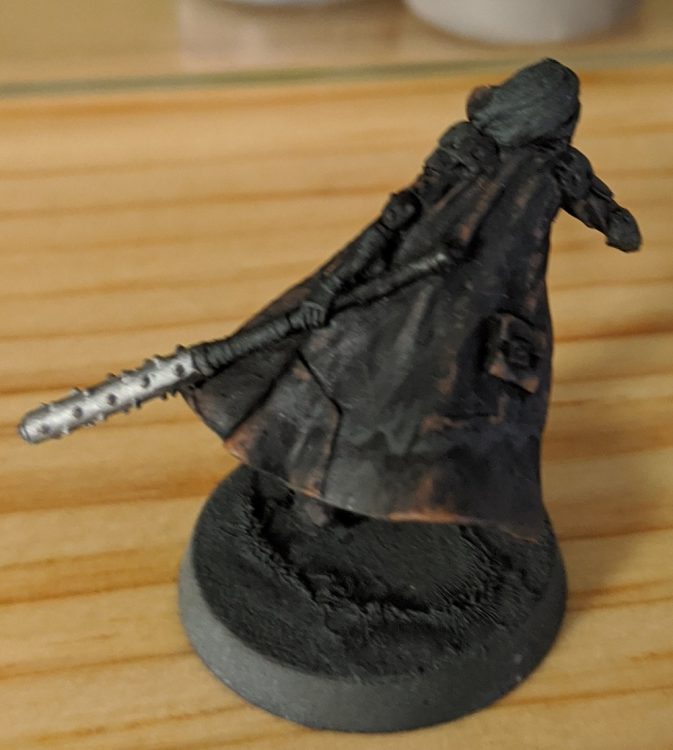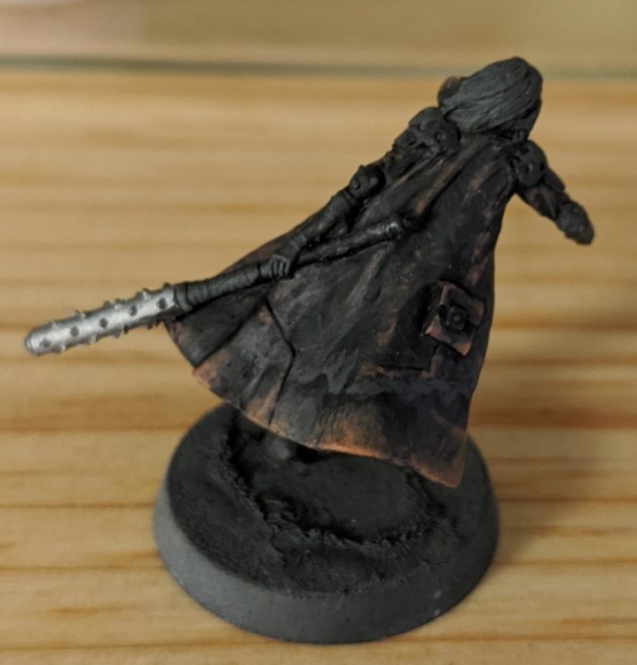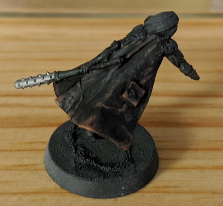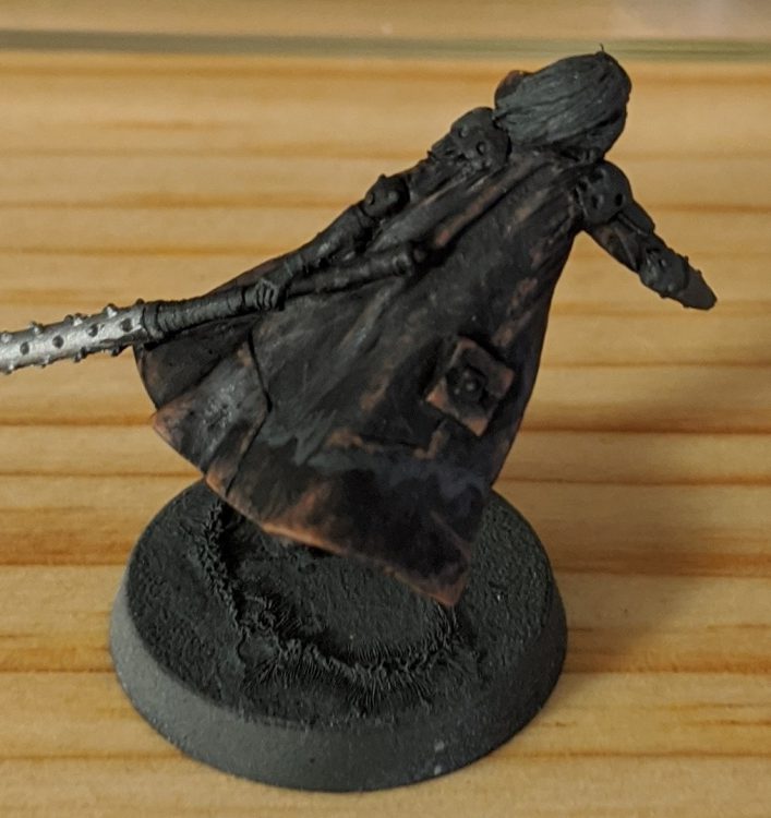 At this point, you could stop if you don't want to add any staining. You've got a heavily worn coat that has been through years of battles. If you do want to add staining, first paint along the bottom of the coat using Nuln Oil, leaving a ragged splotchy edge where the coat has been dragged through mud or water.
