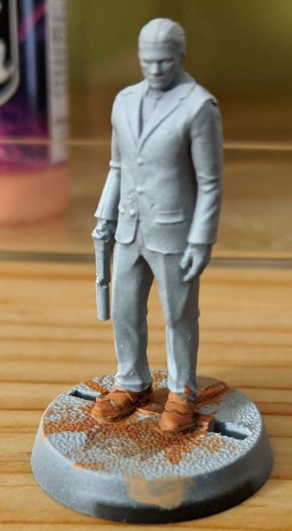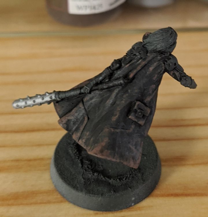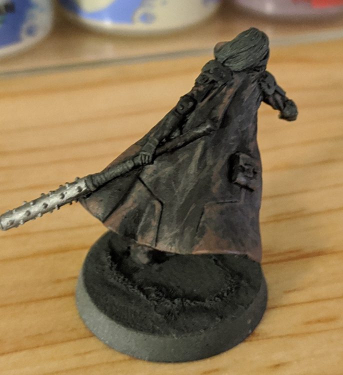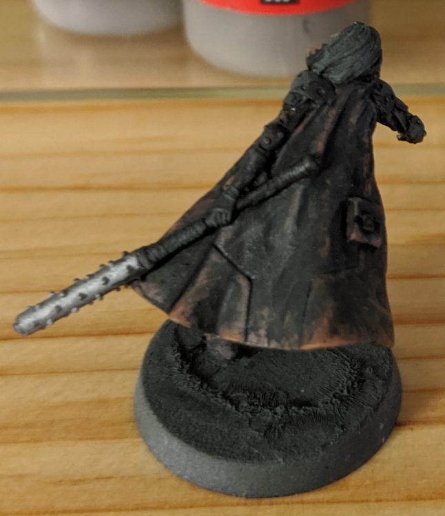 Now just hit the entire coat with a wash of Nuln Oil. This will even out your messy, scratchy highlights a little bit, dull them down so you can add more layers on top of them, and form the main shade for the leather.