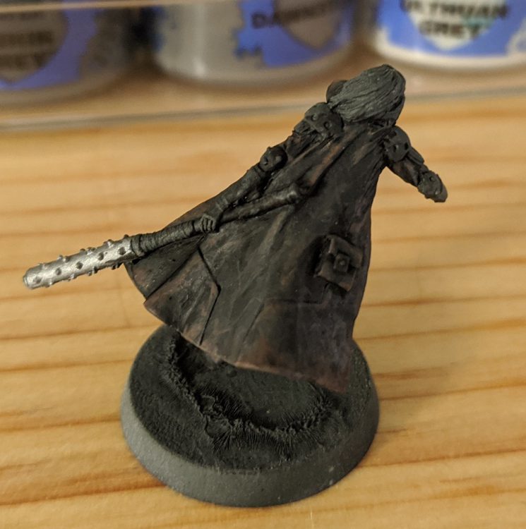 First, toss down your black basecoat, I prefer VMC Black. Then add in some highlights I did a few layers, first with a mix of black and Skavenblight Dinge, then with more grey, then with pure Skavenblight Dinge. I follow the areas that would typically be highlighted, then work in the grey to high wear areas as well. The edged of the coat, pockets, etc. You do not have to be particularly precise at this stage of painting. You're mostly sketching in initial highlights right now.