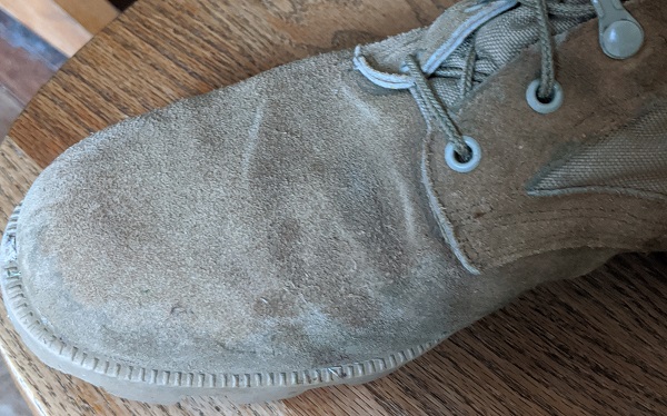 A roughout leather boot. Along the edges it has picked up brown and grey stains from rubbing against dust and dirt.Credit: Evan "Felime" Siefring