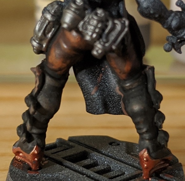 Now take VMA Burnt Umber and water it down quite a bit, and gently glaze over the toe. Burnt Umber is a fairly transparent paint, so it works exceptionally for this. You'll want to do 2 or 3 coats to work up a nice fade. You may have to work some Jokaero Orange back into the edges to smooth it out and fine tune the shape, but luckily Jokaero Orange also thins down into a glaze quite well. If you're comfortable we blending this is also a place it works quite well.