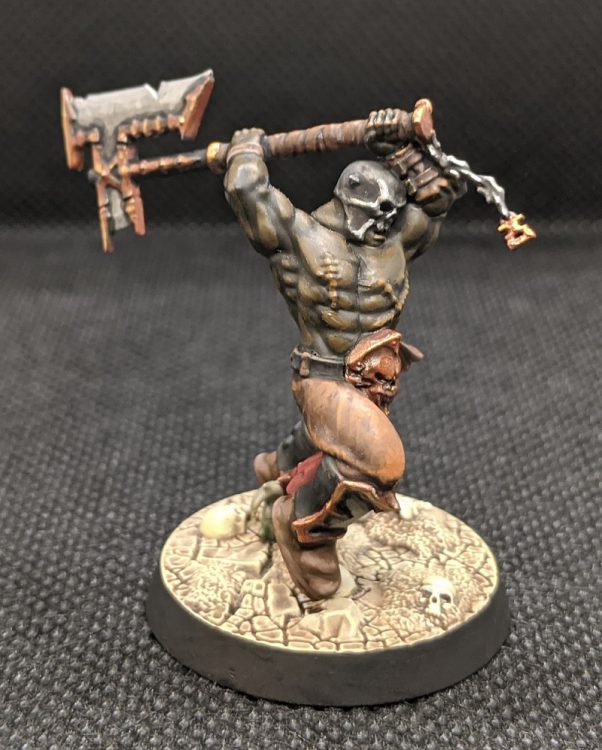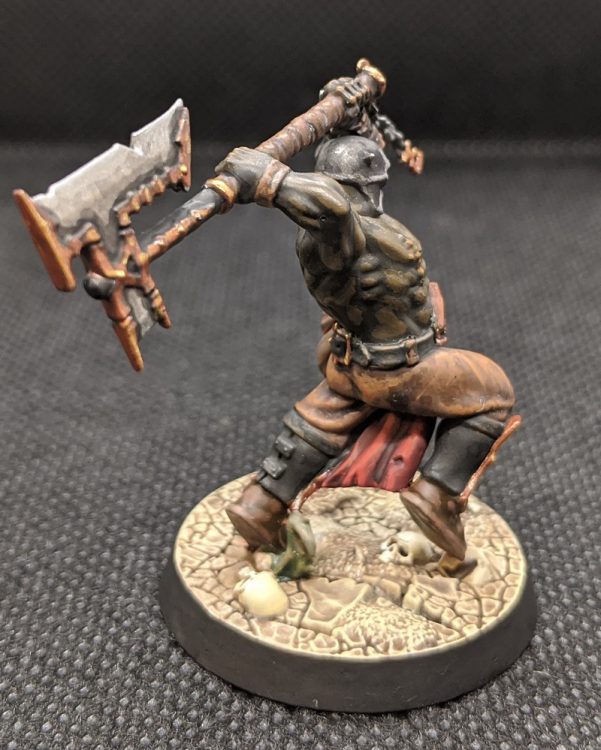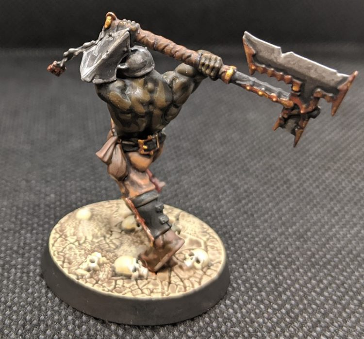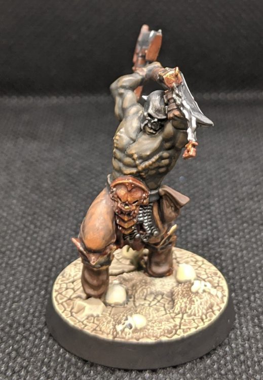 This is one of Garrek's Reavers from Warhammer Underworlds. I decided to go with three distinct types of leather on this model, Light Brown, Brown, and Black. When you're painting a model that has this much leather on it, it's important to separate the areas using different colors and textures. Otherwise you can end up with a model that is just a confusing sea of brown.