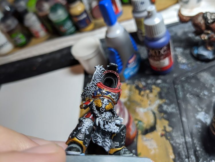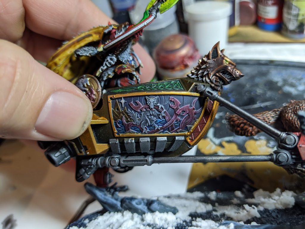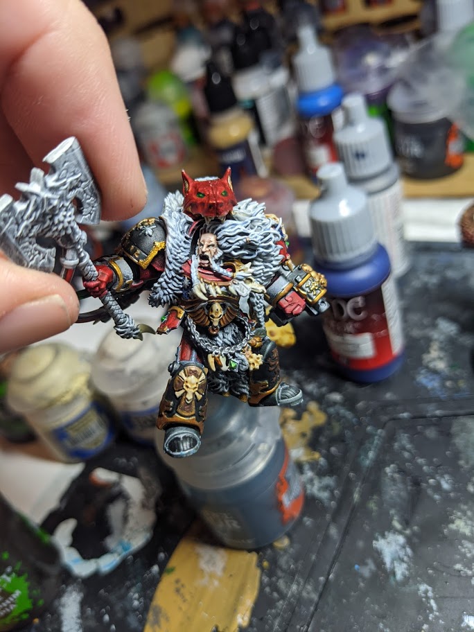 Logan in Progress. Credit: Kevin StillmanThe for the various cords linking the axe to his armor, I decided to paint one set of cords white and Blood Angels Red. This gave them something of a candy cane appearance, which again suited my desires for a festive Logan. Another cord was painted in Ork Flesh. Thus, the traditional Christmas colors of red, white, and green. I painted the Axe Haft with Warplock Bronze, and drybrushed with Retributor Armor. The axe head was painted with tesseract glow, then given a progressive drybrush of ulthuan grey and white scar. And with that, Logan was finished. Now, it was time to give him his ride.