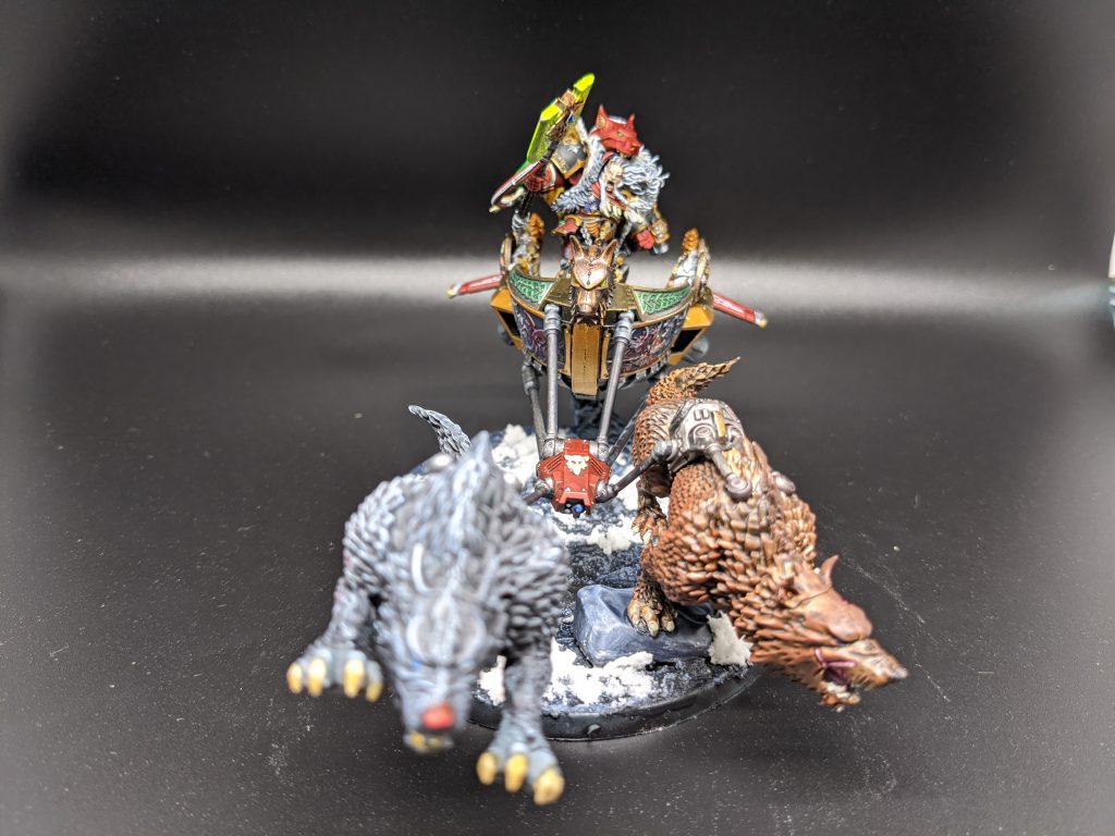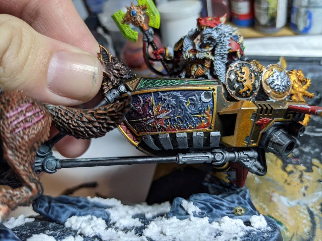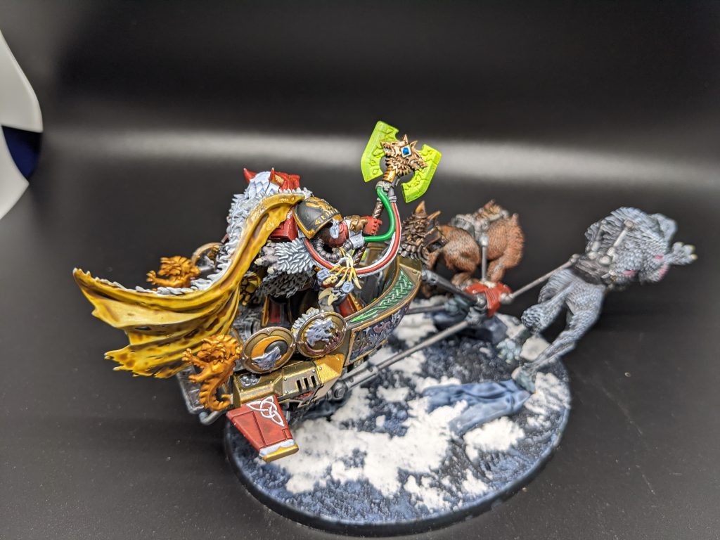 Stormrider is dashing through the snow, a two-wolf open sleigh. It is specifically going through a mound of snow - hard enough to be tall, but soft enough for a sleigh to hover through. I painted his Space Wolves Grey.Stormrider Proper received an initial drybrush of Scale 75 Black Metal, followed by a lighter drybrush of Iron Hands Steel. This drew out the oodles of detail in the model, as well as serve as a base for how I wanted to do the sleigh.