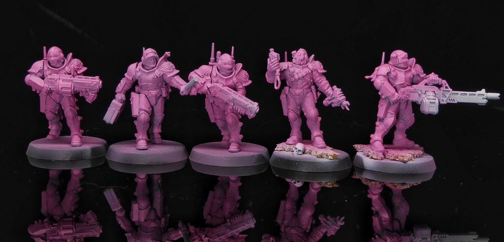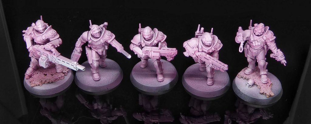 Pink Cops (still don't invite them to pride)Over a white primer, these guys got an all over coating of Emperor's Children. I then used my airbrush to do a zenithal coating of my favorite white paint (at the moment, Pro Acryl's Bold Titanium White, but use whatever works best for you). This can also be done with a heavy, targeted drybrush: