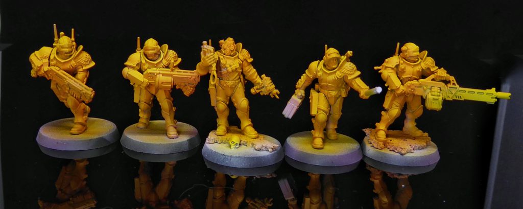 Finally, I sprayed Imperial Fists contrast paint all over the models. It gave the yellow a wonderful warmth. Over the next few days I would just look at the models and spin them around in my hand, as it was such a beautiful yellow. You can see the difference that the pink made by looking at that one dude's Heavy Stubber, as it didn't get any pink on it.