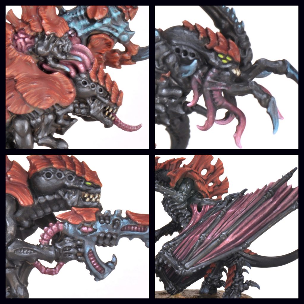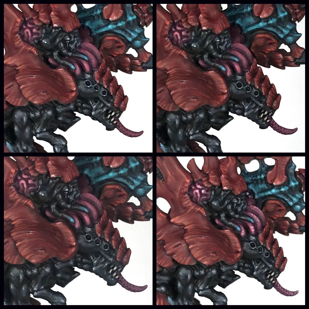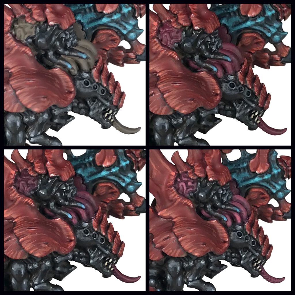 I’ve been painting up some new tyranids this summer in the scheme of Hive Fleet Kronos. They have black skin, with red carapace and teal weapon & claws. I decided to use pink as an accent, particularly on the fleshy bits and tentacles. It also contrasts nicely with greenish blue hues elsewhere on the models. For this tutorial I’ll go through my pink step by step on the fabulous new barbiegaunt!- Top left: This is the brown primer I start my models with. It’s Stynylrez Ebony Flesh.