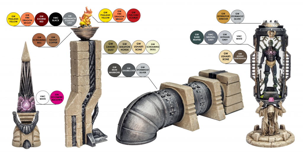 Brazier Metal The copper color of the braziers were painted by drybrushing Screaming Bell over black primer and then highlighting it with a drybrush of Hashut Copper.- Basecoat: Citadel Chaos Black Spray Primer
