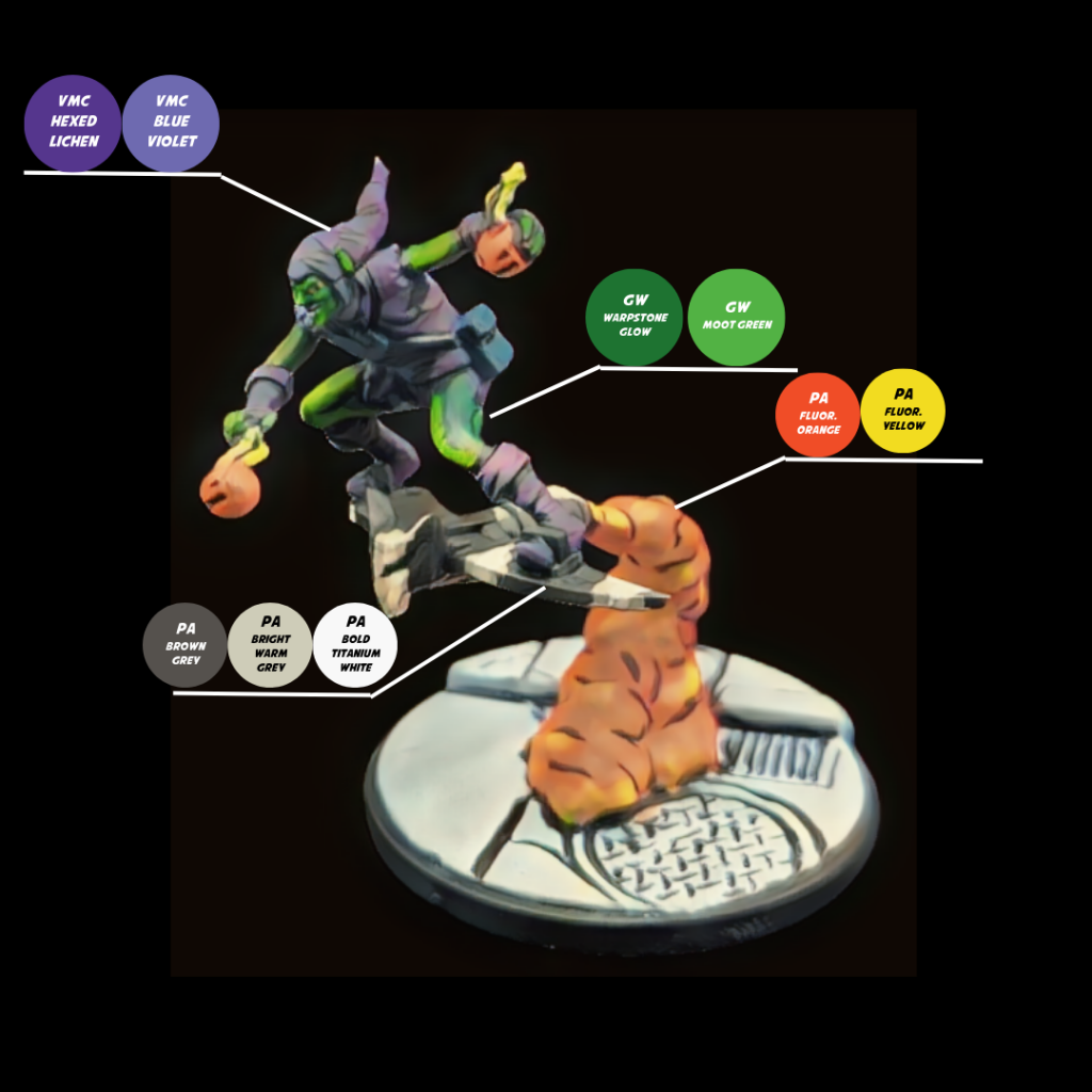- For his pumpkin bombs and exhaust from his hoverboard, i based them all with Vallejo Game Color Glacier White because I knew I was going to use fluorescent colors, and those really benefit from a light basecoat. I then used PA Fluorescent Orange and PA Fluorescent Yellow over that light basecoat.
