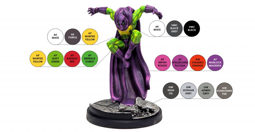 Prowler's suit is a bold green and purple scheme, which is a nice change of pace when you've been painting a bunch of black and dark suit color schemes, which are plentiful in these new Web Warriors boxes. As always, below you'll find a handy color chart featuring all of the colors that were used on Prowler. Let's get into it!