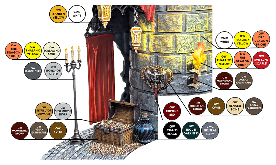 Basecoat - Citadel Retributor Armor Drybrush - Citadel Stormhost Silver Gemstone - Citadel Mephiston Red Gemstone Highlights - Citadel Wild Rider Red Gemstone Spot Highlight - Vallejo Model Color WhitePainting the Wall Mounted Torch
