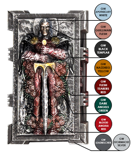 credit: BrushwizardBasecoat - Citadel Chaos Black Spray Primer Drybrush - Citadel Leadbelcher Drybrush - Citadel Stormhost Silver Red Armor - Citadel Contrast Flesh Tearers Red Face - Citadel Contast Guillman Flesh Hair - Citadel Contast Apothecary White Black Areas - Citadel Contast Black Templar Gold - Citadel Contrast Nazdreg Yellow Greenery - Citadel Contast Dark Angels Green Roses - Citadel Contast Blood Angels Red Drybrush - Citadel Stormhost Silver
