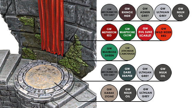 To start, we are going to spray paint the entire main structure of the Tomb with Mechanicus Standard Grey spray primer. Next we will give it a bit of texture by speckling the surfaces with Rhinox Hide, Adminstartum Grey, and Ulthan Grey. To do this, dip a toothbrush into thinned versions of these paints and flick the brush bristles to fling dots of paint across the model. Start with Rhinox Hide and repeat the process with Adminstartum Grey, and Ulthan Grey. Once you're happy with the coverage of these speckles, wash the entire area with Nuln Oil and finally finish it off with a drybrushing Ulthuan Grey. I waited until I was completely finished with the next two sections before washing and drybrushing.Basecoat - Citadel Mechanicus Standard Grey Spray Primer Speckle - Citadel Rhinox Hide Speckle - Citadel Administartum Grey Speckle - Citadel Ulthuan Grey Wash - Citadel Nuln Oil Drybrush - Citadel Ulthuan Grey