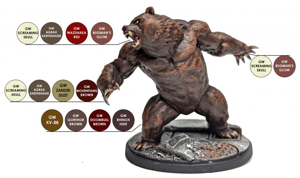 We are going to go very simple on Ursa Major and drybrush his fur, rather than paint individual hair lines like we did on Black Panther, Chosen of Bast's panther companion. We'll start with a basecoat of Rhinox Hide and then work up brown tones with Doombull Brown, Gorthor Brown and XV-88.- Basecoat: Citadel Rhinox Hide