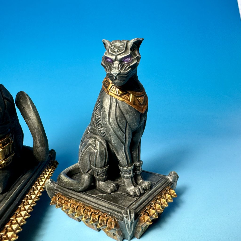 Wakanda Terrain for Marvel: Crisis Protocol. Credit: McBillOnce the metallic areas were done, it was just some cleaning up to do here and there and the statues were done. I did go back a day or two later and add a quick glow effect to the eyes of the smaller statue. I used some purples which looking back at my notes…I did not write down. My best guess is a base of Army Painter Alien Purple, including drybrushing that shade wherever I wanted the glow to hit. Then a smaller layer of some GW Genestealer Purple on the eyes, followed by a dot in the center of Genestealer mixed with an off-white such as P3 Menoth White Highlight. (MWH is the GOAT of off-white paints and my favorite mix-in for making lighter shades.) This was all a little nod to the optional special rules that came with this terrain. (I will probably never use said rules but painting them in regardless of that fact is extremely on brand for me.)