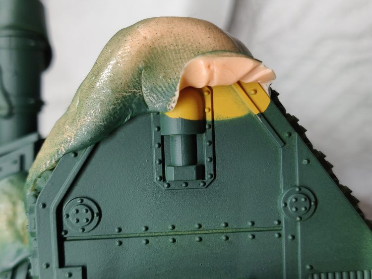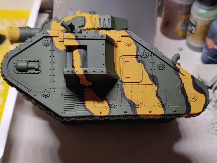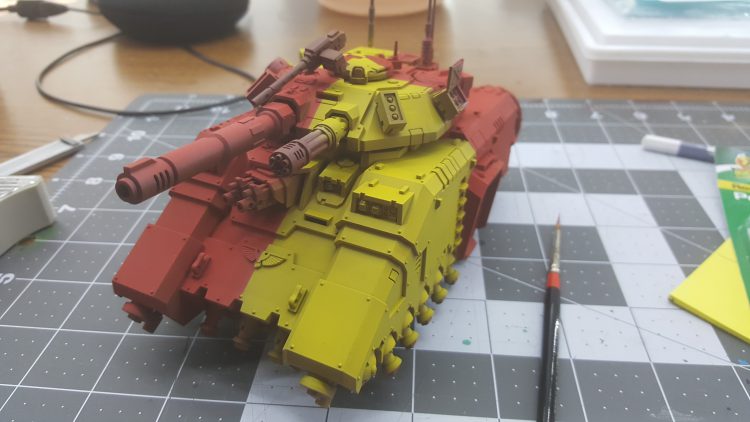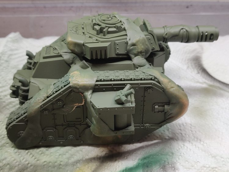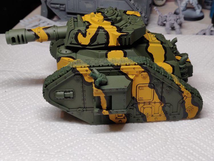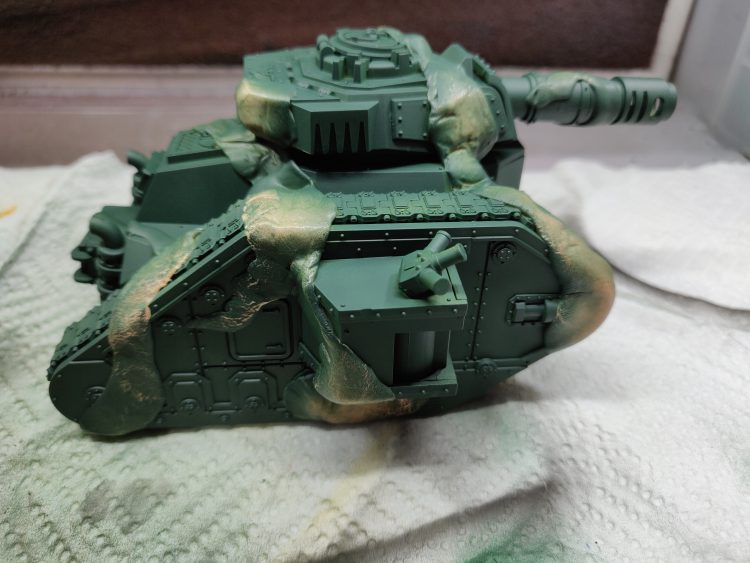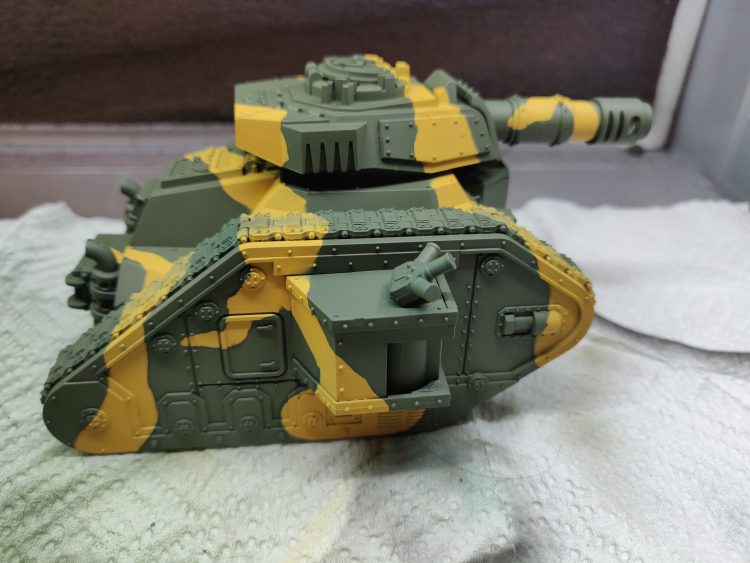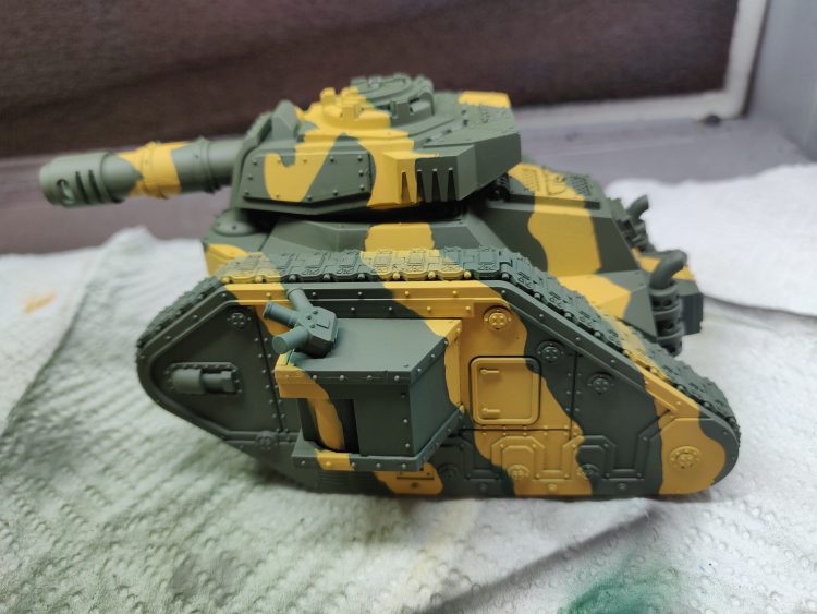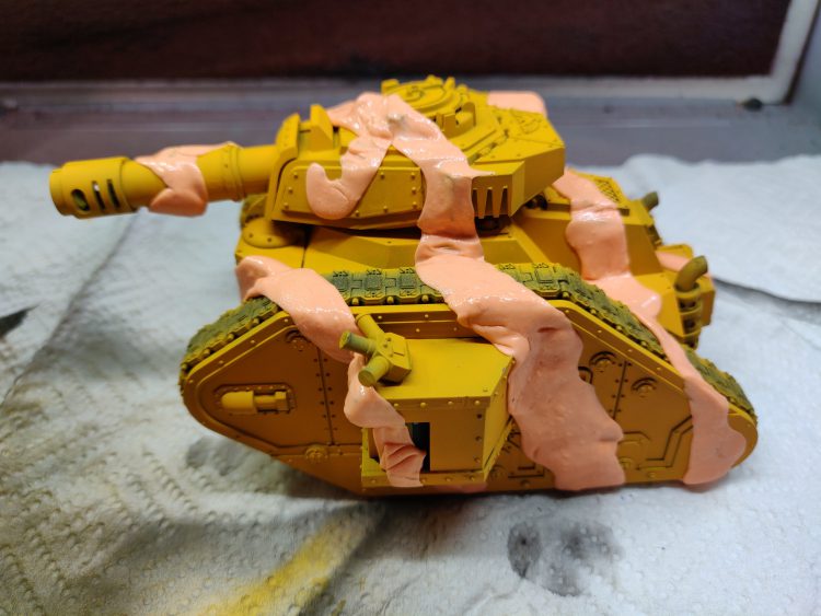 We're starting out with probably the most basic, intro level masking technique - applying a masking agent to your model in order to achieve stripes, camouflage, or even just covering one color to make blocking in another one on the model easier and cleaner. I wanted to achieve something like Games Workshop does for the camouflage on their Astra Militarum models, specifically the Catachans. There are various methods that can be used to achieve this, from using masking tapes to more expensive purpose made hobby masking agents and putties all the way up to purpose made stencils, but I went with arguably the cheapest and easiest - good old Silly Putty. I spent about 15 bucks for a dozen Silly Putty eggs, and two days later had what is probably a lifetime supply in my possession. Not only is it cheap, it's also extremely easy to apply and remove, which is something to think about before you start sticking things to your partially painted models. There's no worse feeling than pulling the tape off of a freshly painted model only to see bare plastic instead of the crisp line you wanted because it was too adhesive; to avoid this, it's best to either stick to modeling tapes such as Tamiya makes, or if you really want to use that masking tape you have sitting around already, make sure to stick it to your pants a couple of times first to make it adhere less aggressively. To start with, I primed everything black and then applied a base coat of Averland Sunset. It's generally easier to start with your lighter color and then apply the darker one over that for the easiest coverage, though with the Citadel Base paints that's less of an issue. Next I pulled and flattened the putty into rough bands and pressed them across the tank, trying to work it into the cracks wherever possible. While this method is great, it's not going to give you perfectly crisp and clean lines when you are finished, so take that into account. After that I gave everything a coat of Caliban Green. While this is the correct color according to the source I was looking at, I decided that I wasn't really sold on the look of this combination of green and yellow. Here you can see some of the 'fuzzing' you get with this method. Having decided to try something else for the green, it was simple to push the putty back on and then apply a coat of Castellan Green. Once you're happy, it's a simple matter of peeling off the putty. As a trade off for adhering a little looser than something like a painted on model masking agent and not giving you that crisp edge, the putty peels off effortlessly without leaving bits wedged in crevices. One other thing to be aware of when doing any sort of masking or stenciling is that it is pretty likely that you will see some small amount of buildup or lip at the edge of the area due to the extra layers of paint. It's not something I worry about but it's good to be aware of when you're applying your paint, so try to keep your layers as thin as possible. If it really bothers you or if it's particularly noticeable, you can use a very fine sandpaper to VERY LIGHTLY AND CAREFULLY even it out. Finally, it's time to neaten up the edges. If you're using a two tone scheme use your darker base coat color and a brush to carefully define the line between the two. In the case of the Catachans, the camouflage has a third, dividing color, which is one of the reasons the small amount of fuzziness from using the putty doesn't bother me. And there you have it, a quickly and easily camouflaged tank ready to have the finishing touches applied!