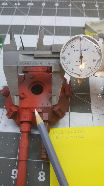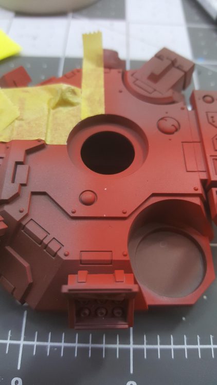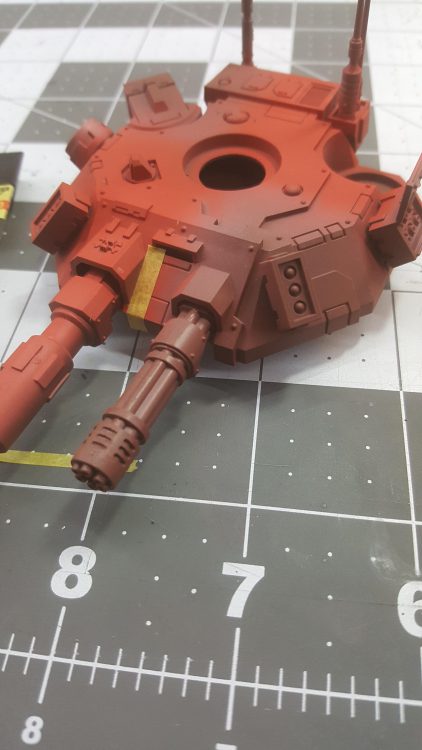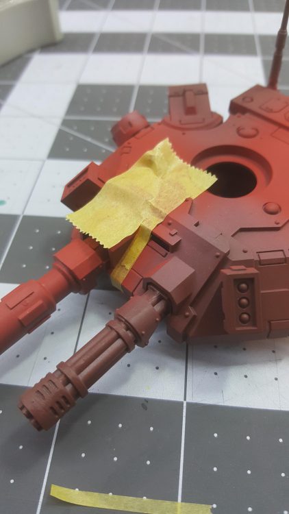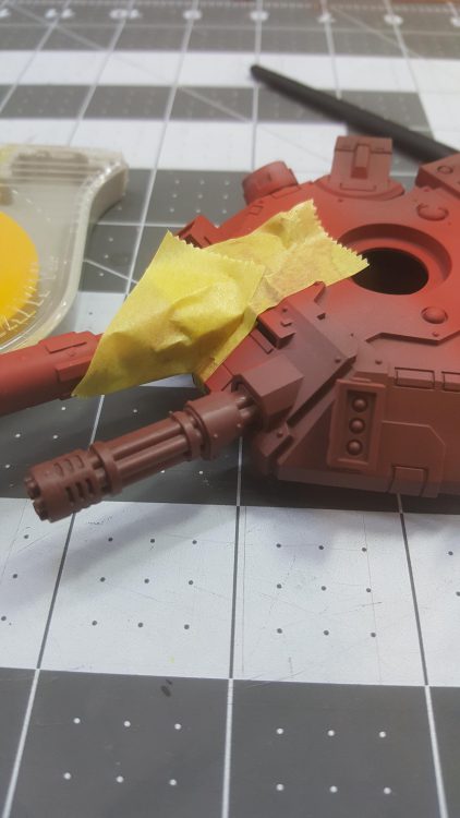 Next we'll take a look at the same idea, only instead using masking tape to get those crisp, clean lines. In order to create something like the quartered paint scheme found on many Space Marine Chapters such as Dexefiend's Howling Griffons, precision matters. If your quarters are more like nickels and dimes, it's really going to stand out, so before you begin, gather all the supplies you will need and start measuring. After determining the exact center of the model, small marks are placed to help guide the placement of the masking tape. Next, using the marks as references, the outermost edge is defined with masking tape. This will be the most important place to get right to avoid color bleeding, so take your time to make sure the alignment is how you want it, to work into crevices as best as you can, and to get your tape completely flat against the model as any bumps or gaps will require cleanup later. You may find it easiest to slice off a smaller piece of tape to begin with so that you are encountering as few hindrances as possible. After that, begin layering outwards. You may well find that the shape of the model will require you to make cuts in the tape with a hobby knife in order to adhere properly. As you get further away from the area where the two colors will be meeting, you can afford to be a little less form fitting, though you still need to ensure you're not leaving any gaps for paint to find its way into. Finally, define the other edge of the quarter the same way as you began, and then it's time to get painting! The finished paint job really makes the model pop, and you'll be wowing your friends with your much more complicated seeming scheme in no time! This method is also perfect for adding honor markings, geometric shapes, hazard stripes...really anything that wants that crisp look.