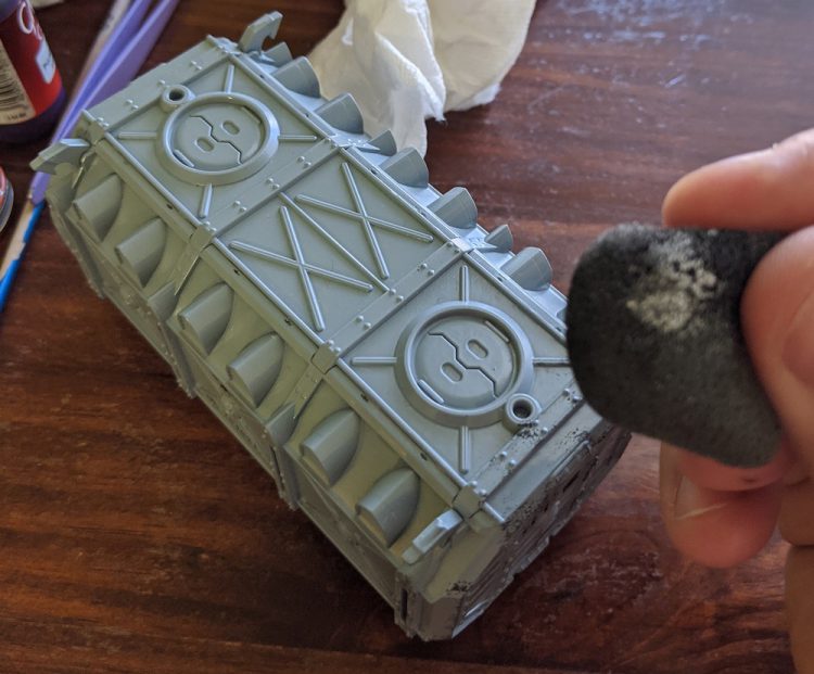 This technique can be applied to other terrain with similar large smooth surfaces, such as the panels on the sector mechanicus terrain, or the boxes and barrels that come with the munitorum armored containers.