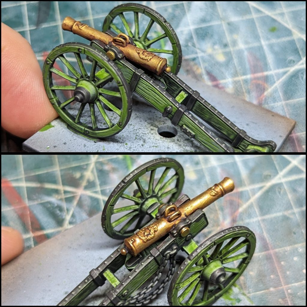 - Gun carriage, rammers, sponge, buckets etc - VM olive green mixed 1:1 with contrast medium.