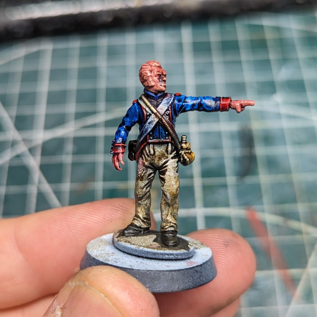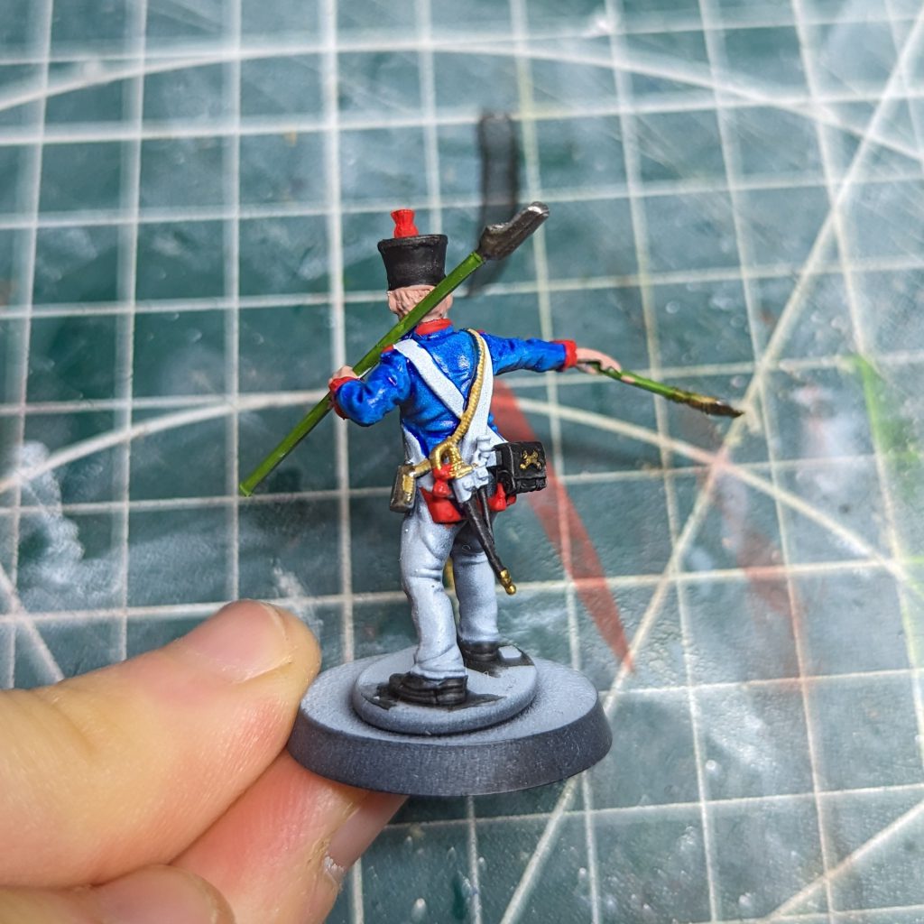 Whites - apply a highlight to the white areas of the model (trousers, waistcoat), using PA titanium white thinned with a little water. For the most part the zenithal and washes will have done the work for you here, so it's only the extreme highlight you're adding.
