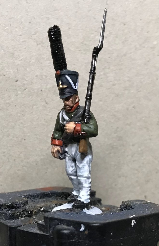 Wraithbone gives a nice base for every colour we're usingJacket - Vallejo Russian Uniform Green Greatcoat (wound around body) - Army painter Uniform Grey Trousers and Gaiters - Citadel White Scar Red cuffs, collar and turnbacks - Citadel Word Bearers Red Black (Shako) - Citadel Contrast Black Templar Black (Leather) - Abaddon Black Musket - Vallejo Beastly Brown Skin - Citadel Bugman's glow
