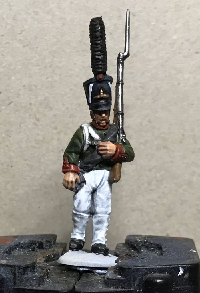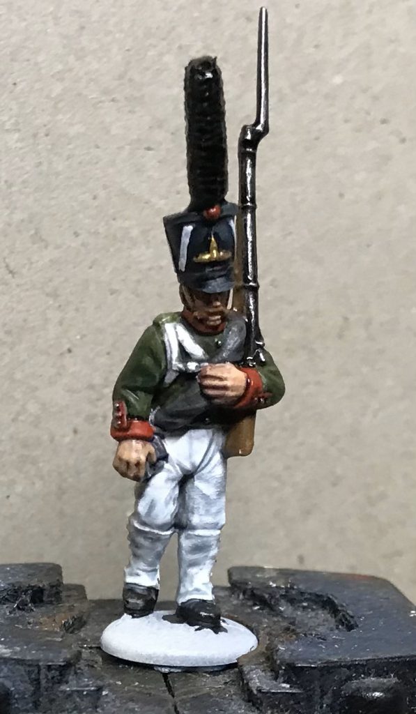 I've painted this Russian Grenadier following Osprey's Russian Army of the Napoleonic Wars (1). From start to finish this was about ten minutes of painting time (excluding drying), and I think would work extremely well as a batch painting scheme in order to do battalions in record time. This is a "typical" Russian line regiment Grenadier - White Trousers and Gaiters down to a black shoe, with black shako and plume, green jacket with red cuffs, collar and turnbacks with white straps.