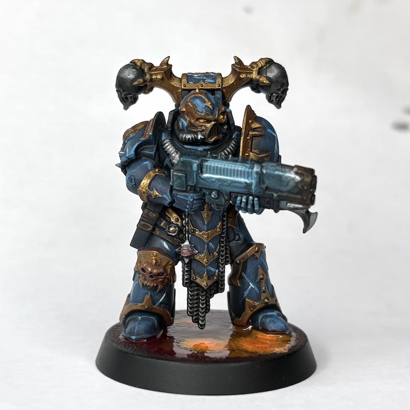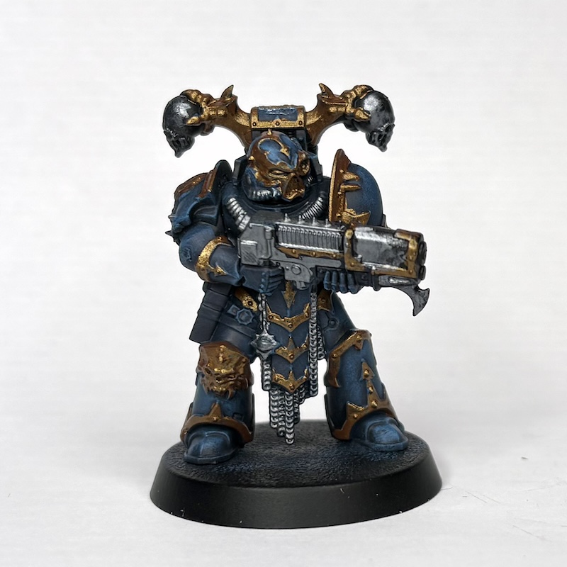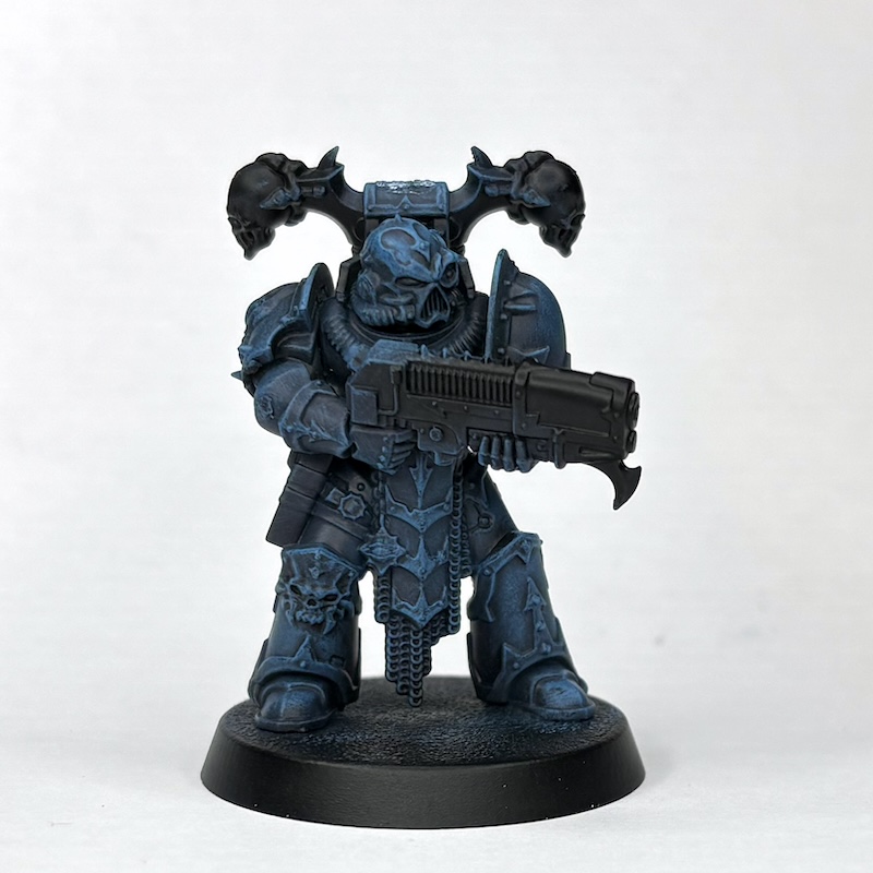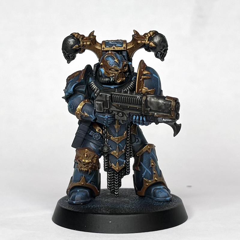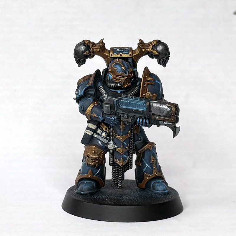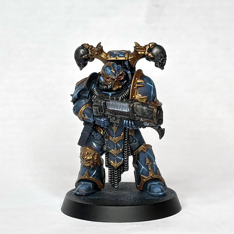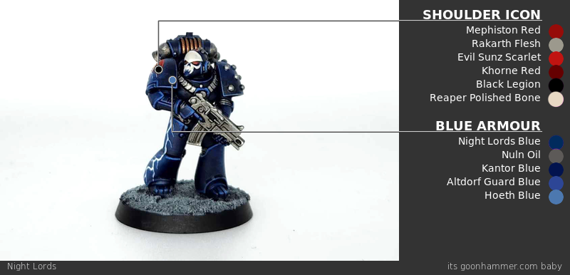 Despite being the 2nd edition poster boy/studio army faction, Night Lords have one of, if not the, most complicated color schemes of any of the Chaos Space Marine legions (the Flawless Host probably give them a run for their money, though). This is because of the army's signature lightning bolts -- their dark blue armor is streaked with lightning bolts , and the process of painting these can be very daunting for a new player. Add to that gold or brass trim and you've got a difficult scheme to tackle. The upside is that, aside from 40k models having more gold trim to paint and fewer chunks of flayed flesh, the paint scheme for the Night Lords is pretty much the same for 40k as it is for the Horus Heresy. And as always, we've got your back and are presenting multiple ways to tackle painting your Night Lords.