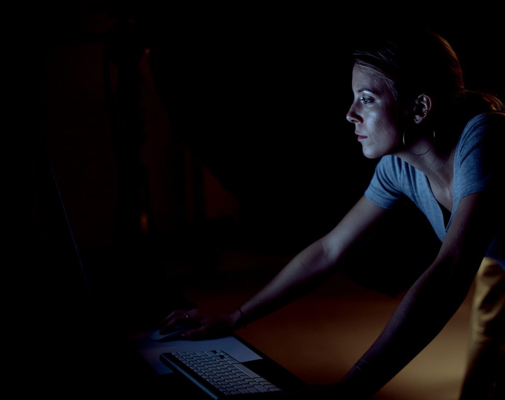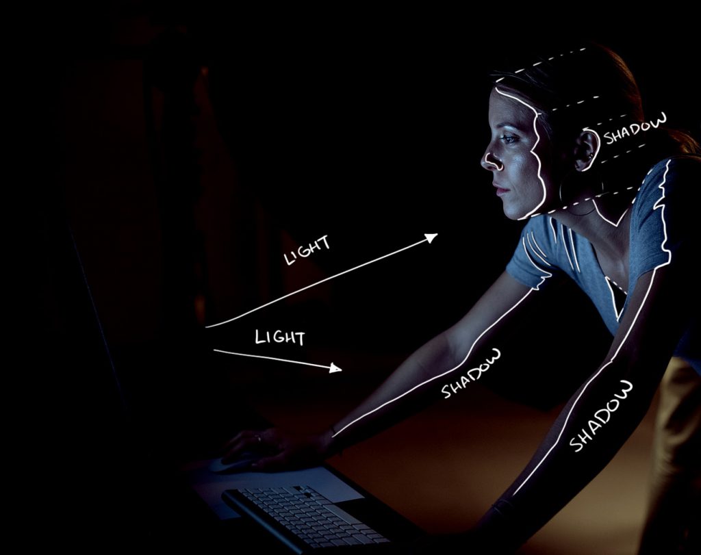 Creative working on the computer in a studioThere's some cool stuff going on with this photo, where the woman is mostly being lit with white light. One of the things I specifically want to point out is the shadows - where the light does and does not reach. Generally speaking, unless there are any mirrored or very reflective surfaces around the subject, the light being cast is going to "stop" (yes I know this isn't what actually happens but for our purposes it'll do) when it hits a solid object. The space behind that object will then appear to be a shadow if you're in a low-light situation.
