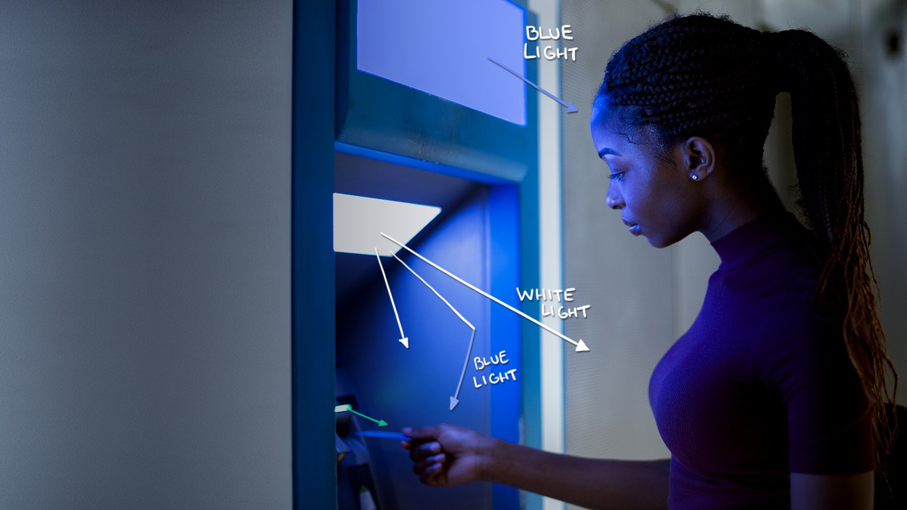 Woman withdrawing money from a cash machineIn this example we have two different light sources: A blue light above the woman's head that's lighting her blue, and a white light from the ATM that's lighting the rest of her, and you can see the difference in how that affects the color of her forehead and hand in the photo above. There's also a separate thing going on where the blue wall of the ATM is doing some tinting, but that's kind of besides the point. The point is, we can paint a model normally when it's going to be in white light, and then apply OSL color on top of that to get a specific effect.