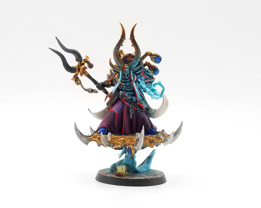 If you're looking to go even harder on this, the next step is to put a bit more work into your your shadow effects to increase the contrast, and to improve your blends on the lit areas. Contrast paints will generally work great on metallics and other lightly-colored areas, but the big challenge is that they can only darken those surfaces, so to get your best results you'll need to do some actual blending to make those lit areas work. An example of this is the Ahriman I recently painted, where I needed to blend Baharroth blue and Screamer Pink on the robe to get the highlighted parts right.