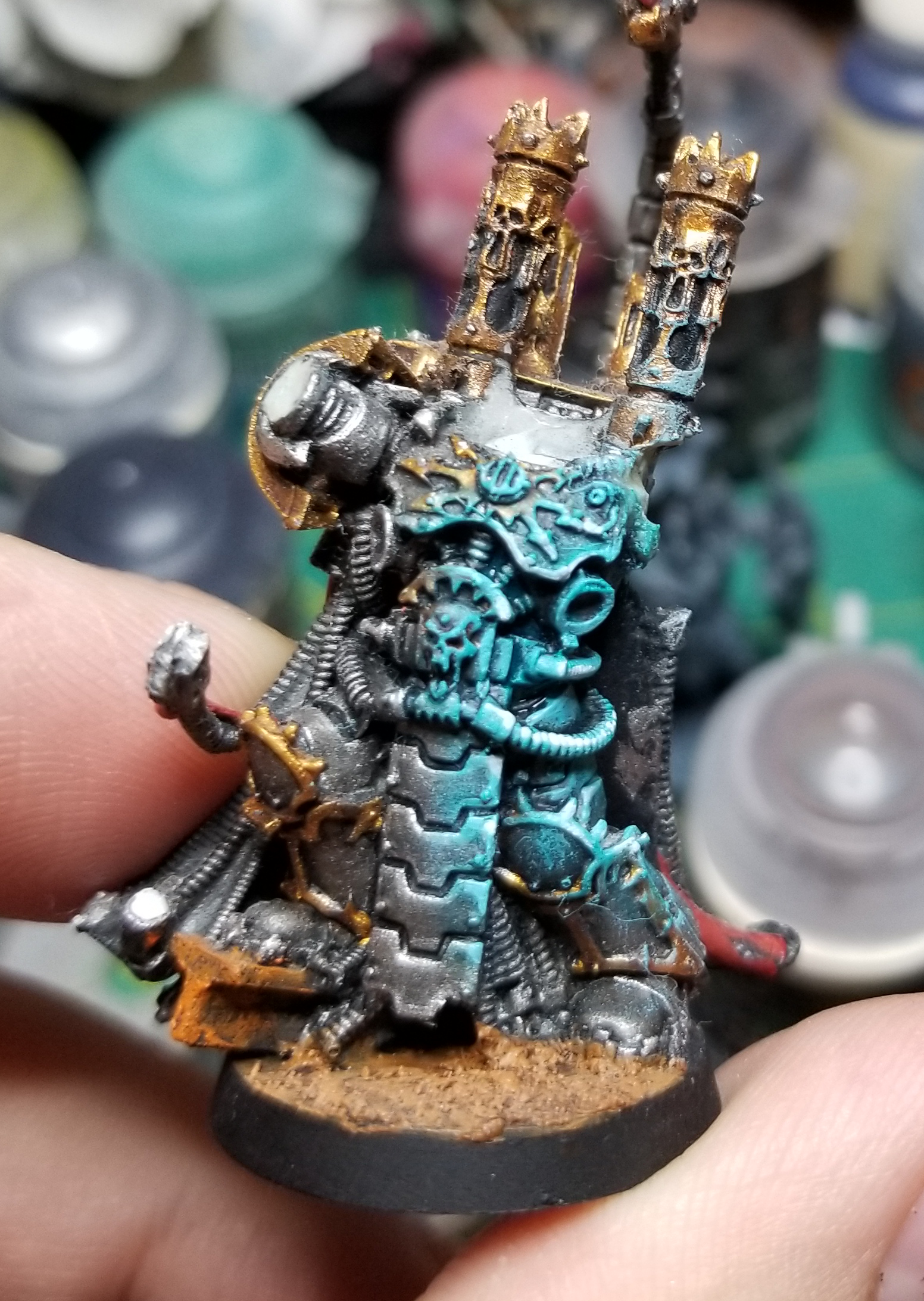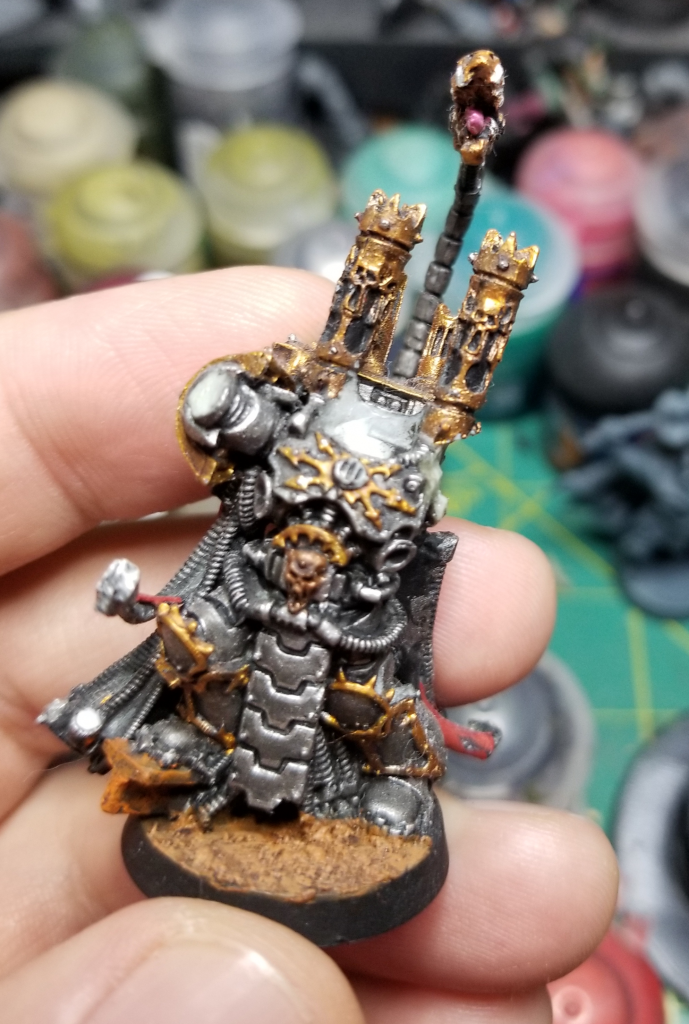Look at this stupid model. Its backpack tendrils overhang the base so you can't remount it on a bigger baseI originally painted this model to be an Iron Warriors Warpsmith back in like 2013. He broke apart when I moved and I decided a good time to fix him and repaint him was "never." Finecast sucks and I hate it. The key thing here is that I've already painted the model normally - he's painted like I'd paint him if he wasn't being lit with OSL. that's important. Next I need to plan my lighting.