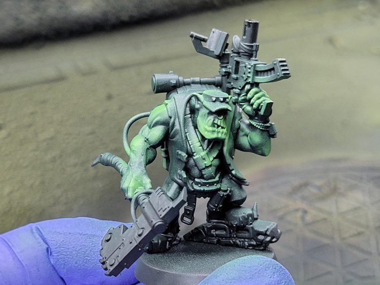 The first thing to keep in mind with the greggles technique, is you've gotta clean your models really well. Find every mouldline and make it smooth. If there are noticeable gaps, try and smooth them out or fill them. I primarily paint with washes/contrast, so any type of bump or crevice is going to be multiplied by the process. Note: Before anyone gets excited, I had the idea to paint up the old ork kommando model at the same time, to provide some fun old school times. The model was finecast and broke while I was painting it, so it will disappear from the images.