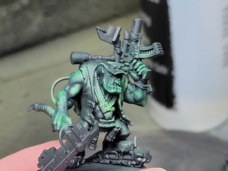 Step 2: Cover somewhere between 50 and 75% of the model with Game Air Sick Green. I kept pressure fairly low, worked close in, and made sure I was always spraying down at him. Doing this let me keep a fair bit of dark green in recesses.
