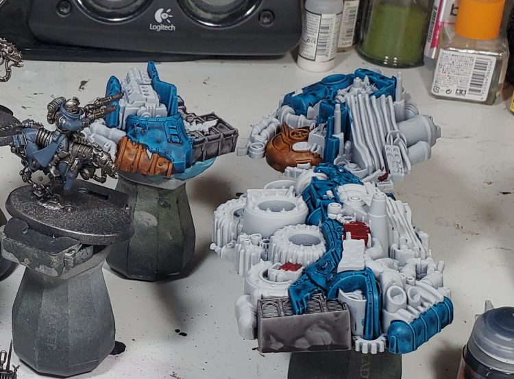 - Red armor plates were basecoated with Gal Vorbak Red, then roughly brushed with Mephiston Red.