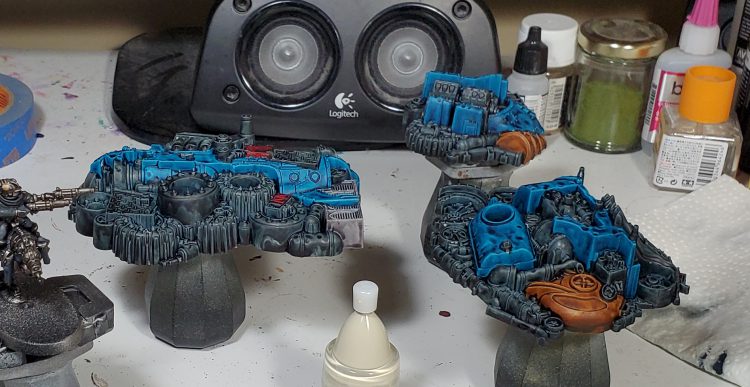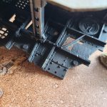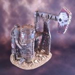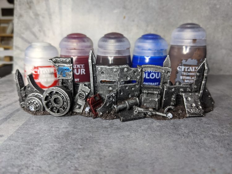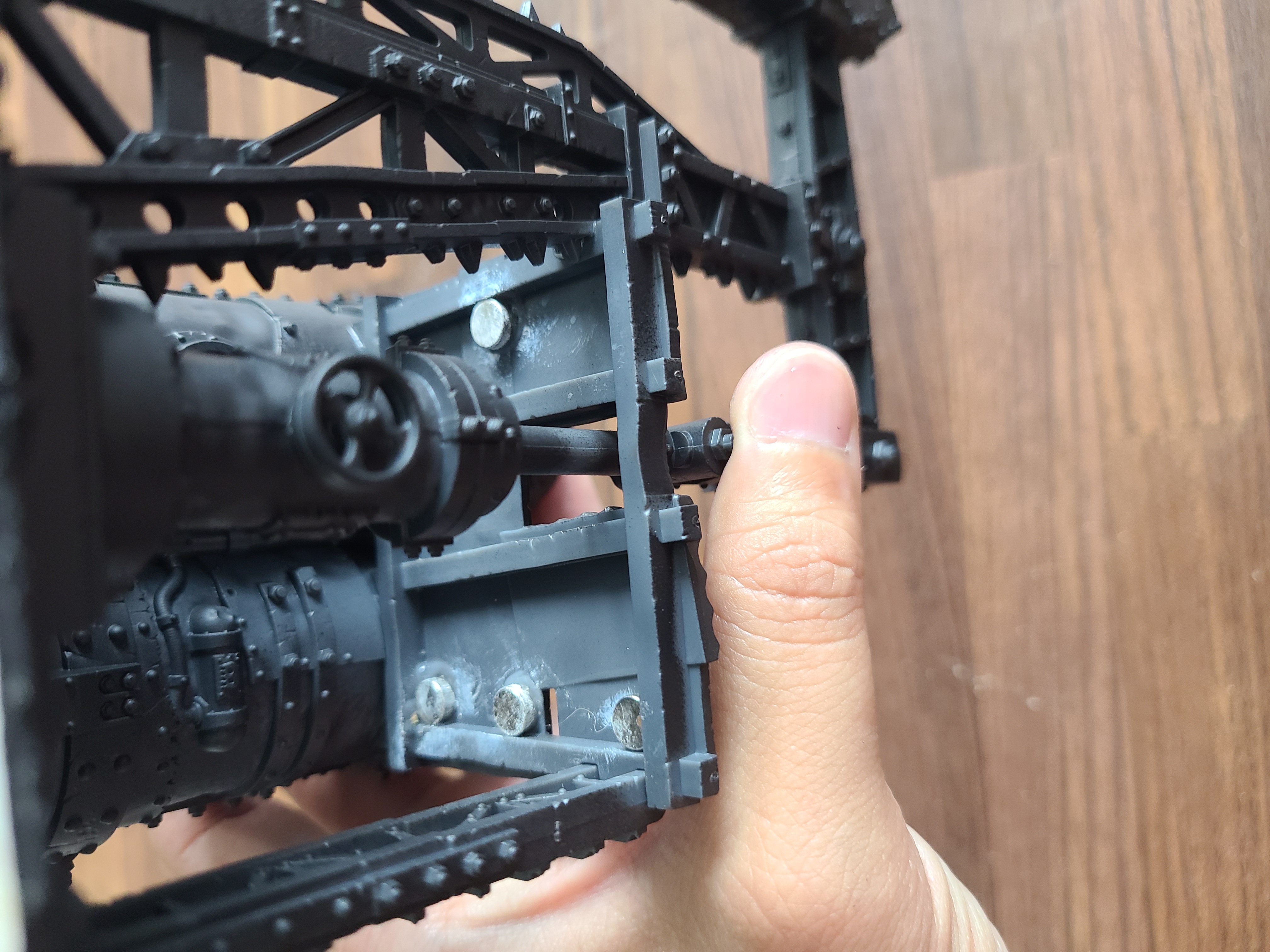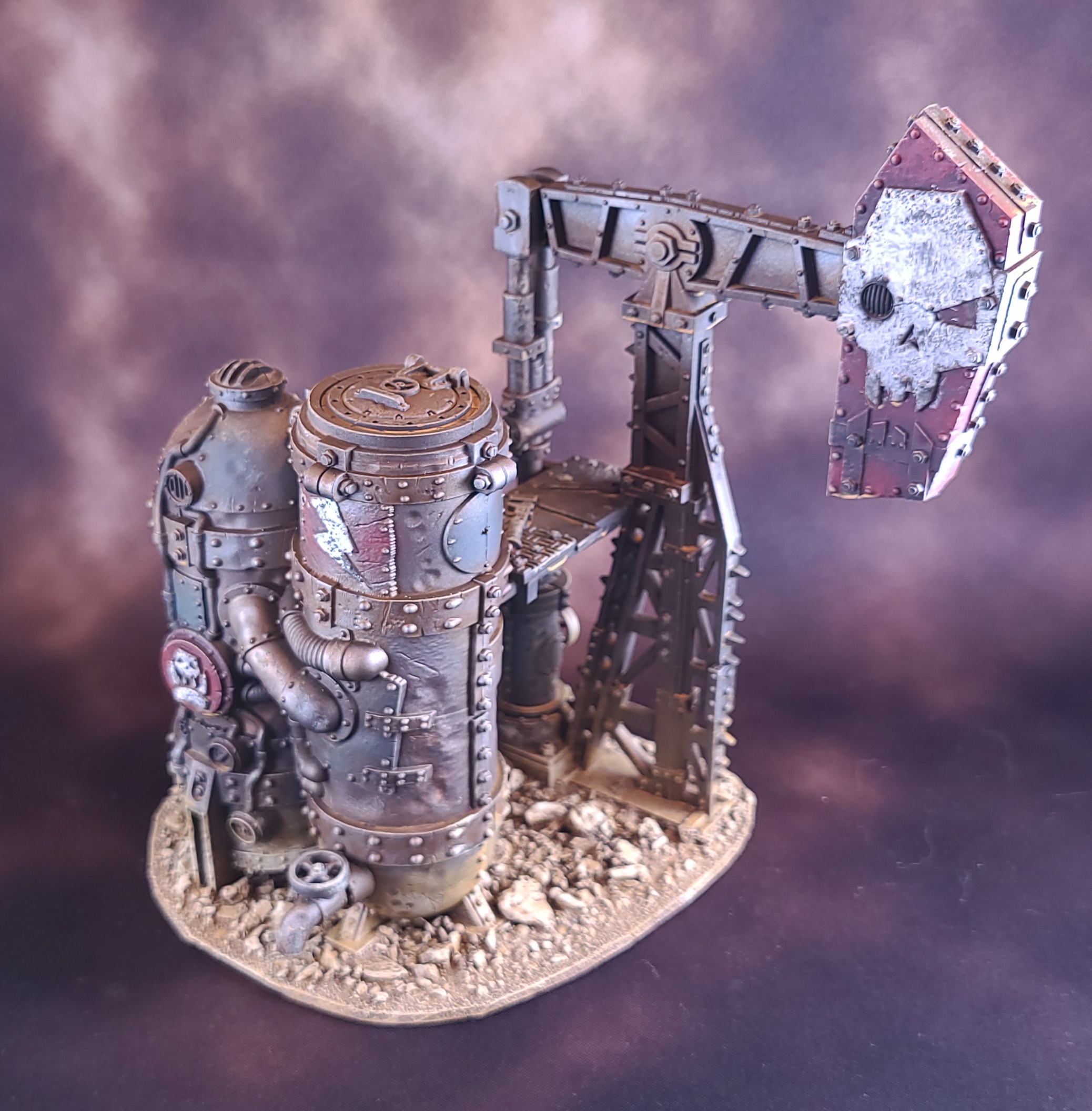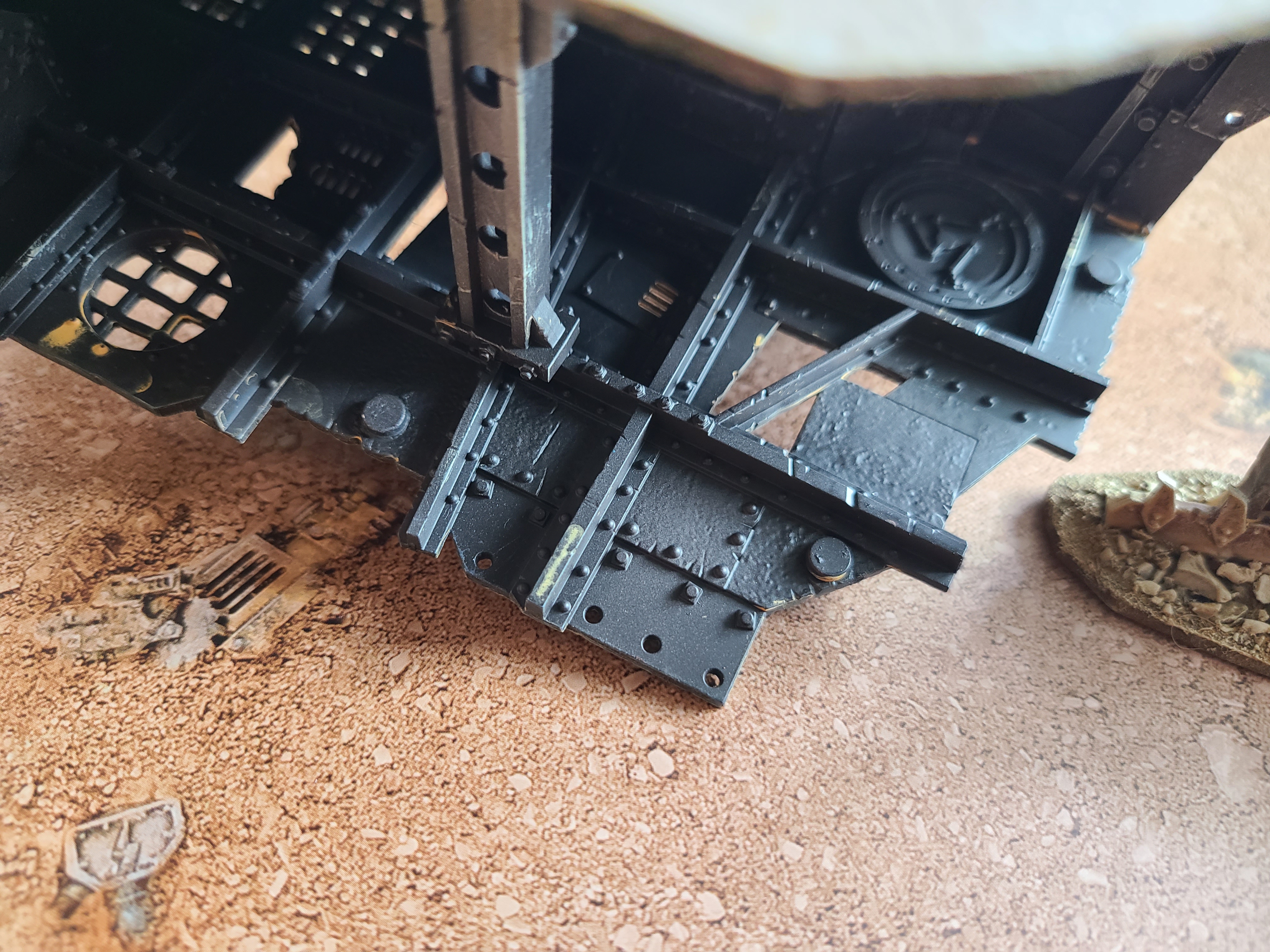 The metal was then done by taking a drybrush and way overloading it with leadbelcher and just going ham on the metal until all but the recess we covered to some degree. This results in a nice worn metal for not too much effort, after that I picked out a few lights with wraithbone + sepia. Then it was time to rust everything by slopping on super watered down Skrag brown to places where water would collect, to push the rust further I also applied some watered down mournfang to a few spots.
