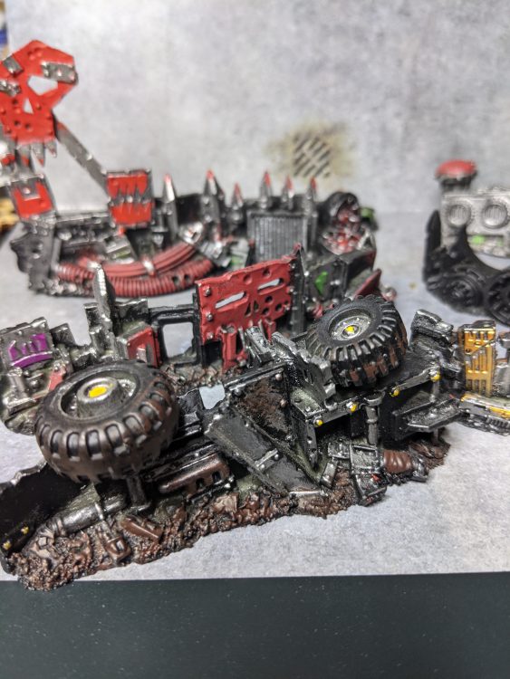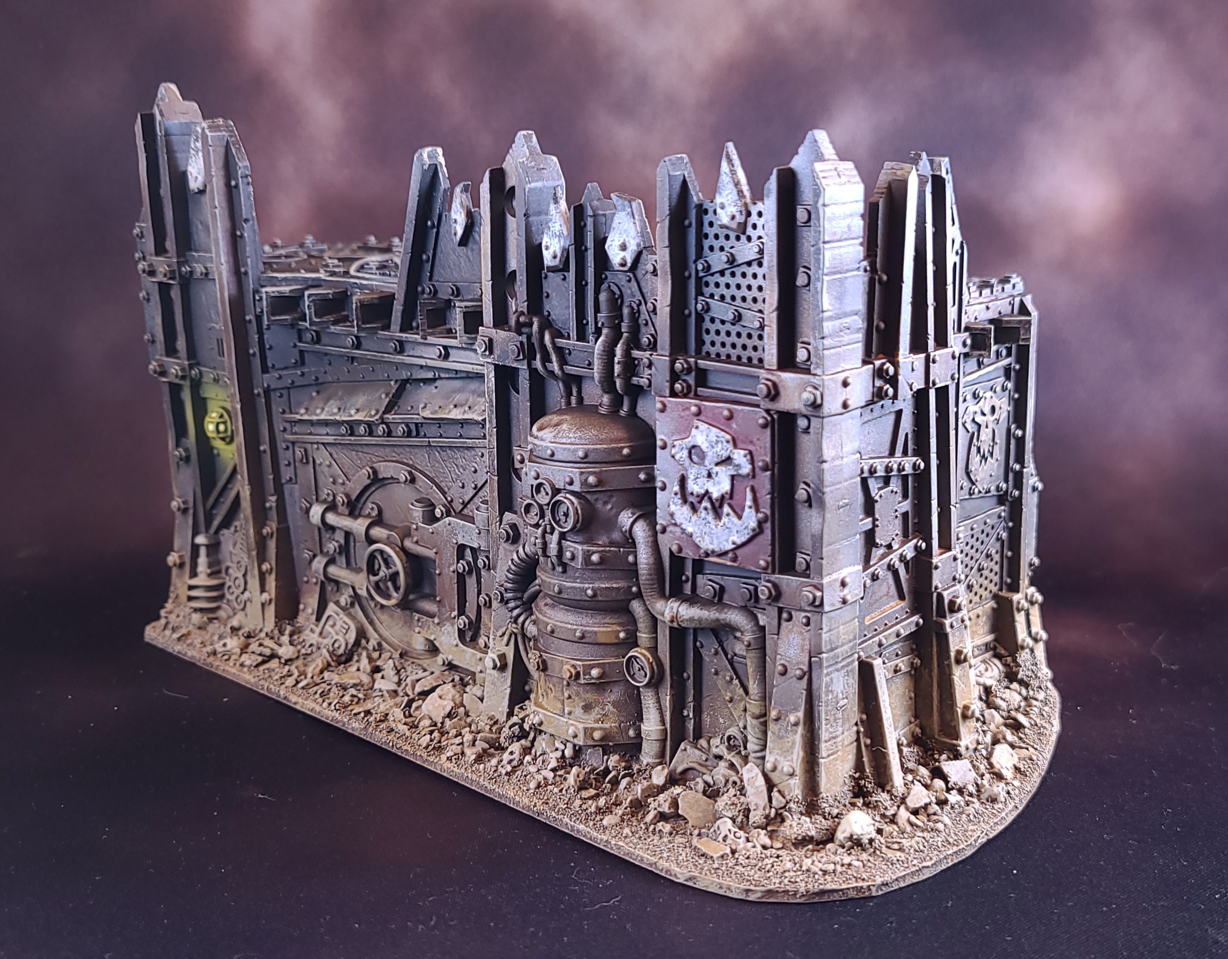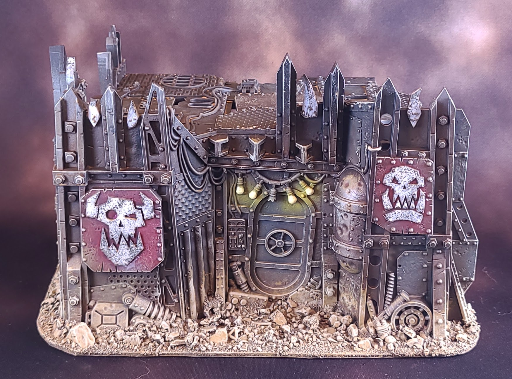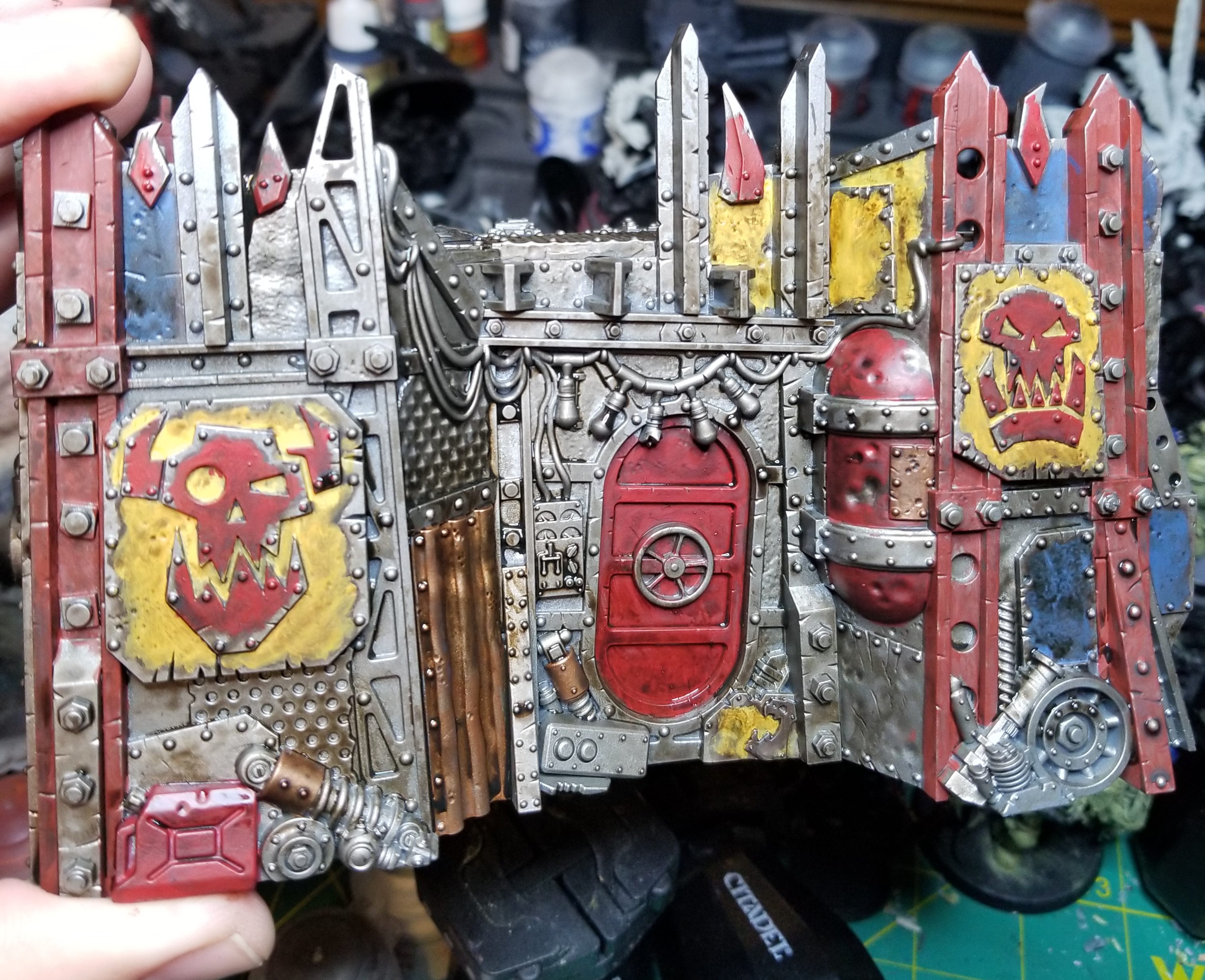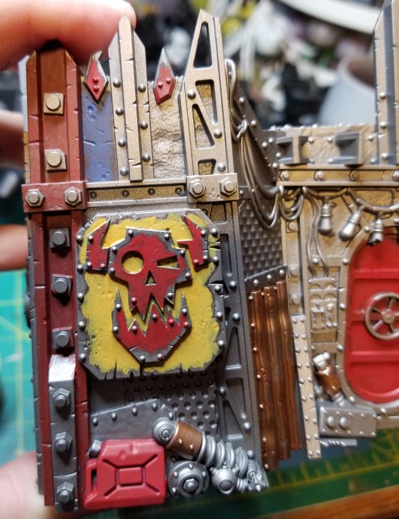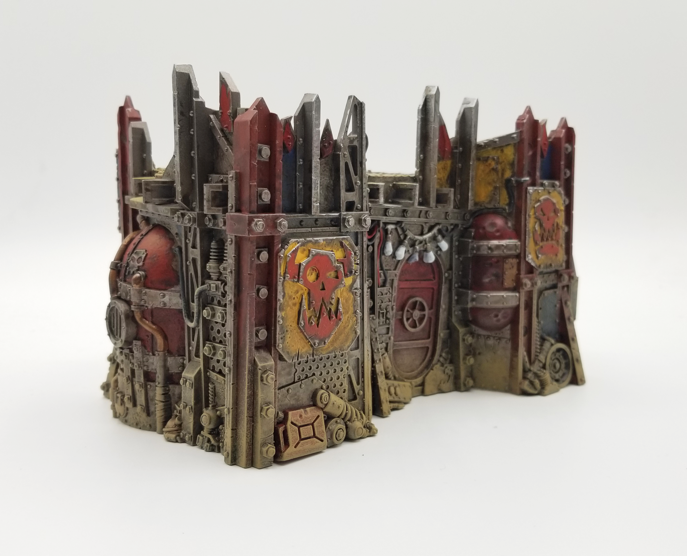 It's worth noting how, just like Rob, I've tended to avoid the edges of the panels I've painted in red and white. This helps convey the notion that this was some battered piece of metal stolen from something else, and has the added advantage of you not having to do an extra stage. The take home lesson for me with ork scenery is that it's an opportunity for you to be loose, sloppy, inconsistent, experimental, and to generally just have fun with it.