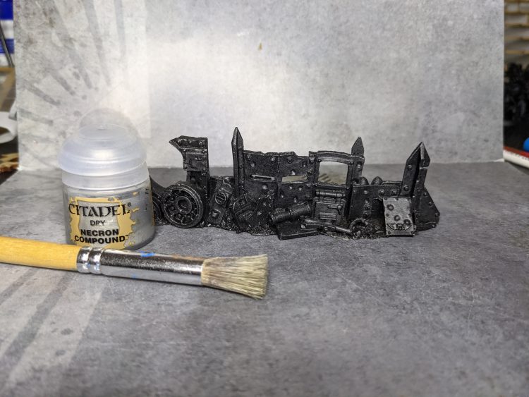 Beanith's Ork Barricades - Dry Brushed Necron CompoundI've applied a thick coat of the Necron Compound using the dry brush method. I'm using a cheap big brush here so I'm keeping an eye out for loose bristles as I go.
