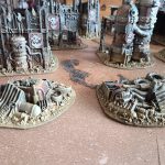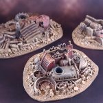 - The bases for each terrain piece were rough brushed with Mournfang Brown, followed by a heavy drybrush of Balor Brown, and a final drybrush of Ushabti Bone.