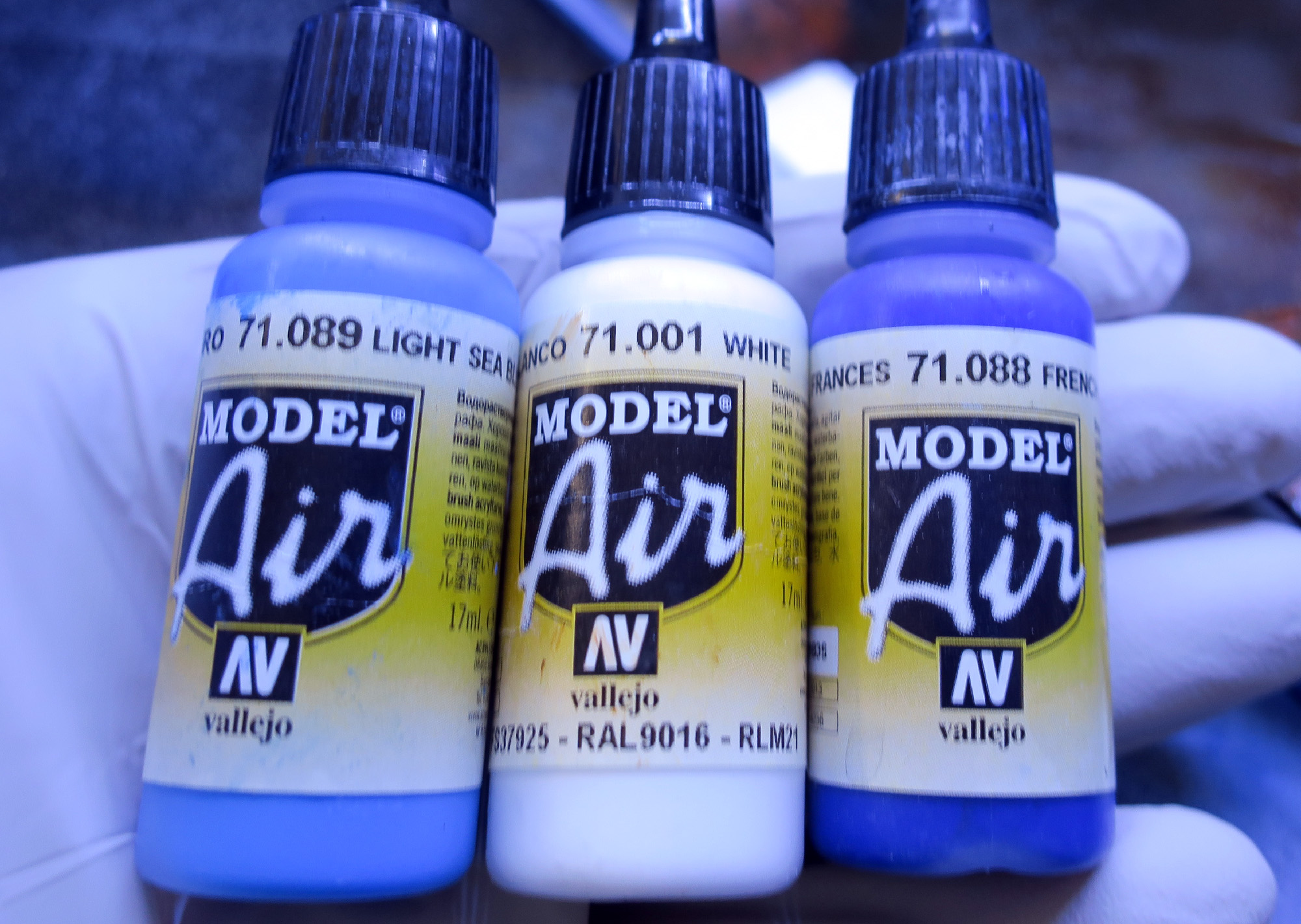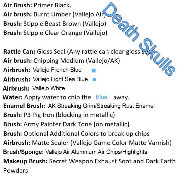 Now it's time to actually put color on the armor. I use the following paints for my Deathskulls recipe: Vallejo french blue, vallejo light sea blue, and vallejo white. (All air colors). You can use whatever colors you want at this step, just make sure they contrast well with the rust tones you have been painting. (Don’t use reds, if you want to do reds, you need to integrate more purple tones into the rust underlayer).