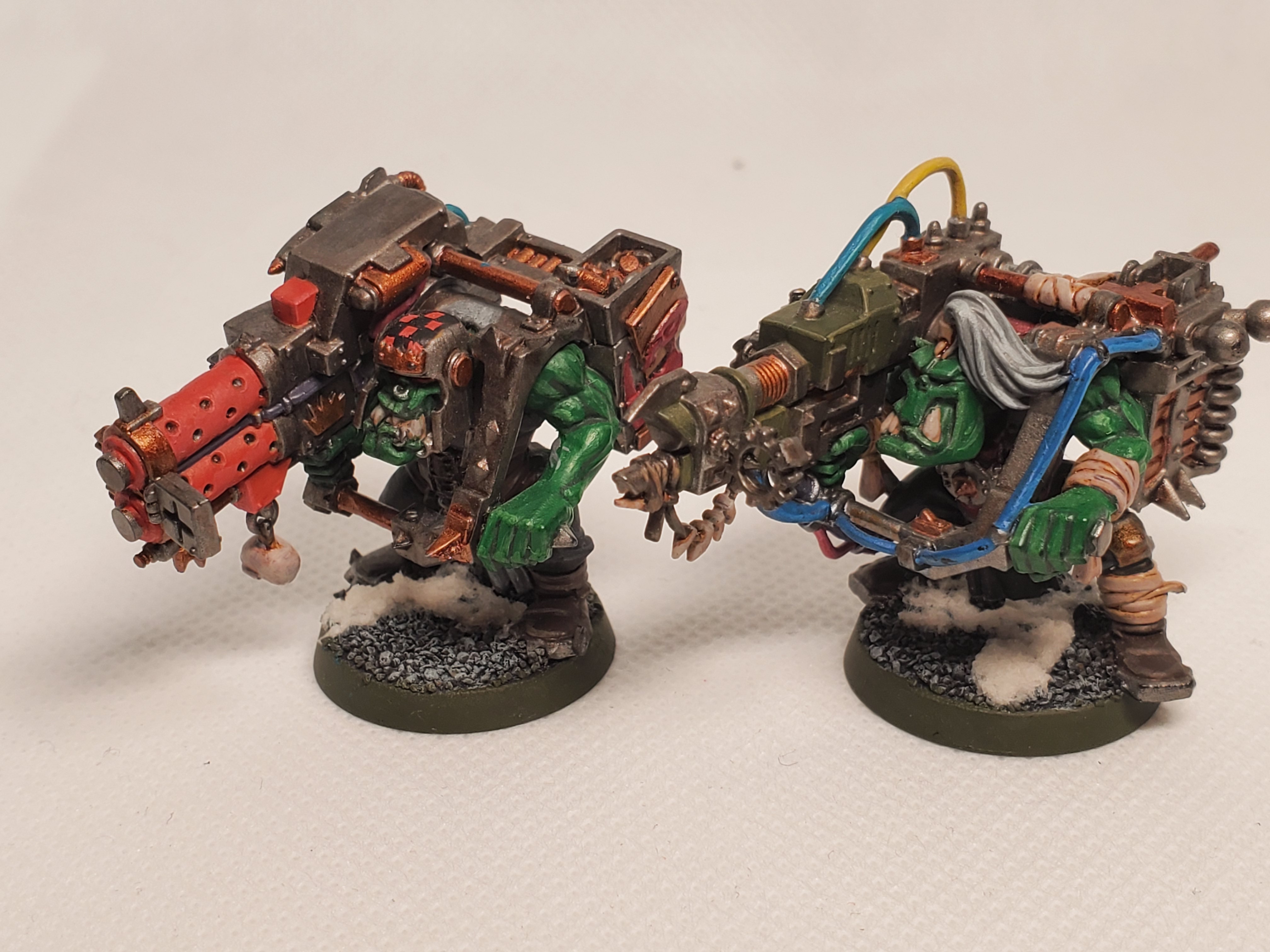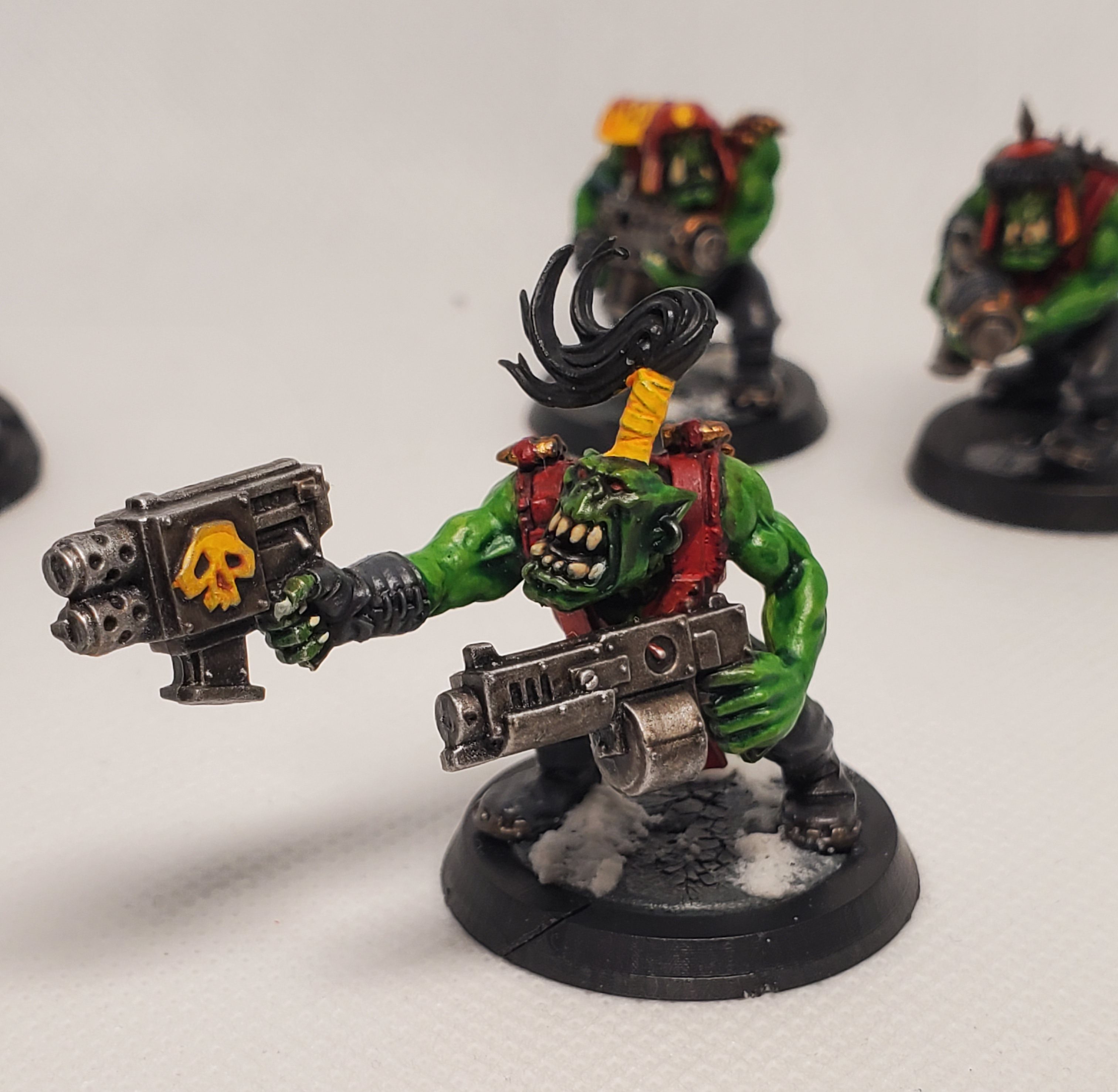 So for the boys these guys were painted when i first got into the hobby a long time ago. For the skin i did a Moot Green and then a tiny amount of dry brush with Waaagh Flesh to darken it just a bit then use Biel-Tan Green for a wash. For the clothing and armor I basecoated with Wazdakka Red and just hit it with Nuln Oil, easy. The teeth were painted with Morgast Bone (that's the new name for that bone color) and an Agrax Earthshade wash. The yellow bits were painted with Flash Gitz Yellow. The gold was Retributor Armour gold with Nuln Oil. The guns were painted with Leadbelcher followed by a heavy layer of Nuln Oil. And the brass is just Balthasar Gold with Nuln Oil.
