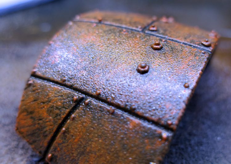 Now we are going to varnish the armor plates. I like to use a gloss varnish from a rattle can for this, because once again, we are going for durability over quality. The varnish will protect the rust layers (that you spent so long building up) from the scratching and ripping we’ll do in the next steps. I let the varnished models sit over night and save the chipping steps for when I have a lot of time. (as generally I do all the armor on a unit or model at once).