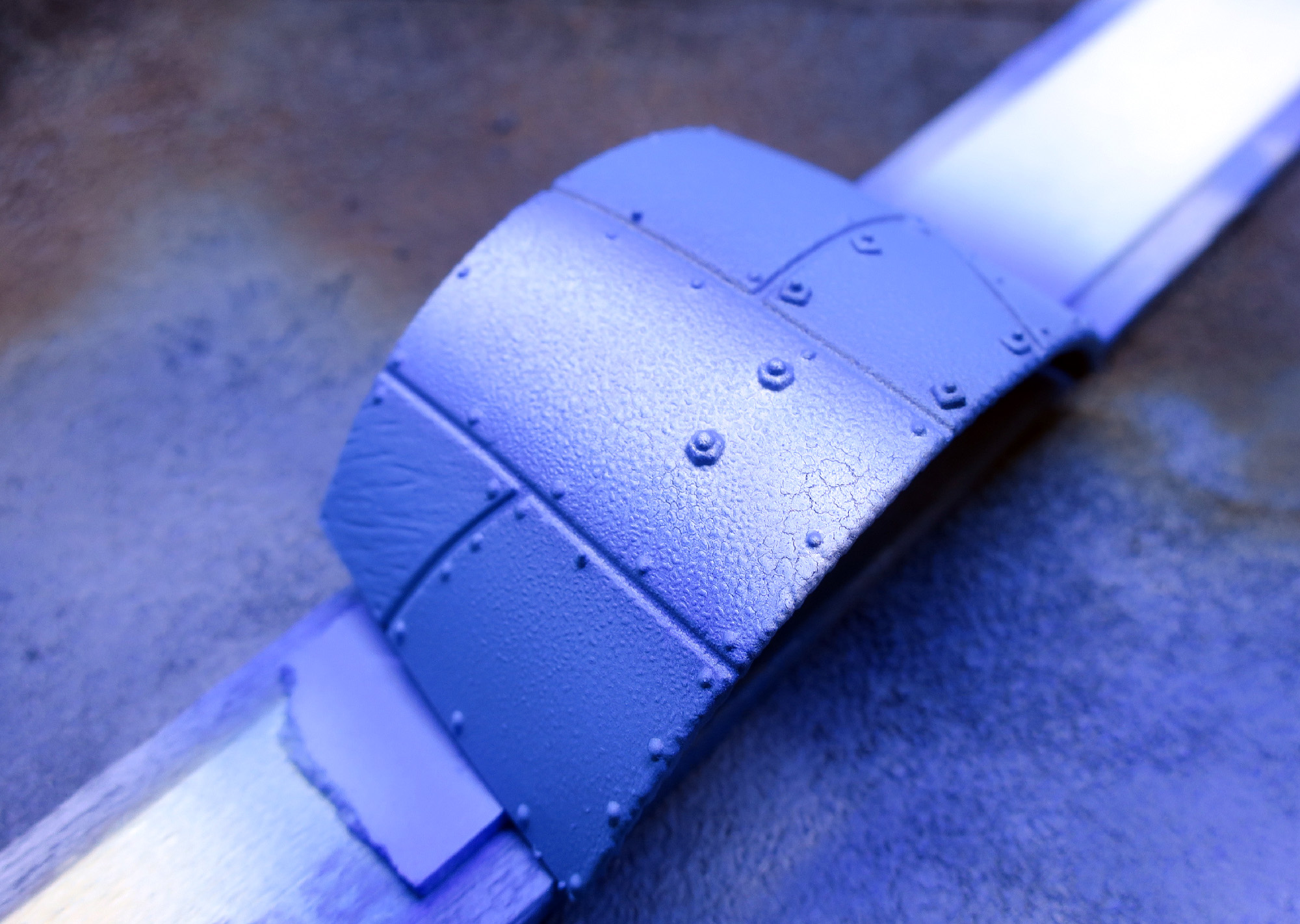 At this stage I pull out some AK Weathering enamels (rust streaks) and apply them over the model to add contrast to the chips. This also dyes the blue to match the rest of my armor (which is kinda of a turquoise blue). You can use other washes (oils are great) to get the same effect. I use enamels/oils over acrylic washes because I can use white spirits to blend and remove excess amounts of the wash, and play with the surfaces to get tonal variances to add interest in the armor plates. When doing either oil or enamels, make sure to give it significant time to dry before proceeding.
