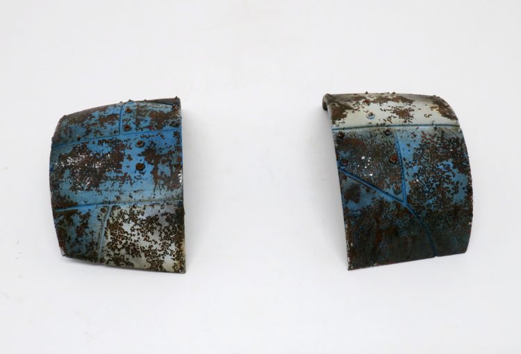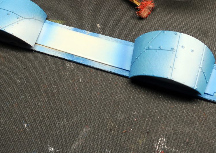 I apply the white first, then hit up with a french blue coat, followed by a sea blue, followed by a bit of white (from above to give some tonal variance). It doesn’t really matter too much if you bleed one color into the next. The chipping takes care of it. This is a messy process, and sometimes “happy little accidents” make the end product even better. Any bleed or cross over here will just create some tonal variance in the end product.
