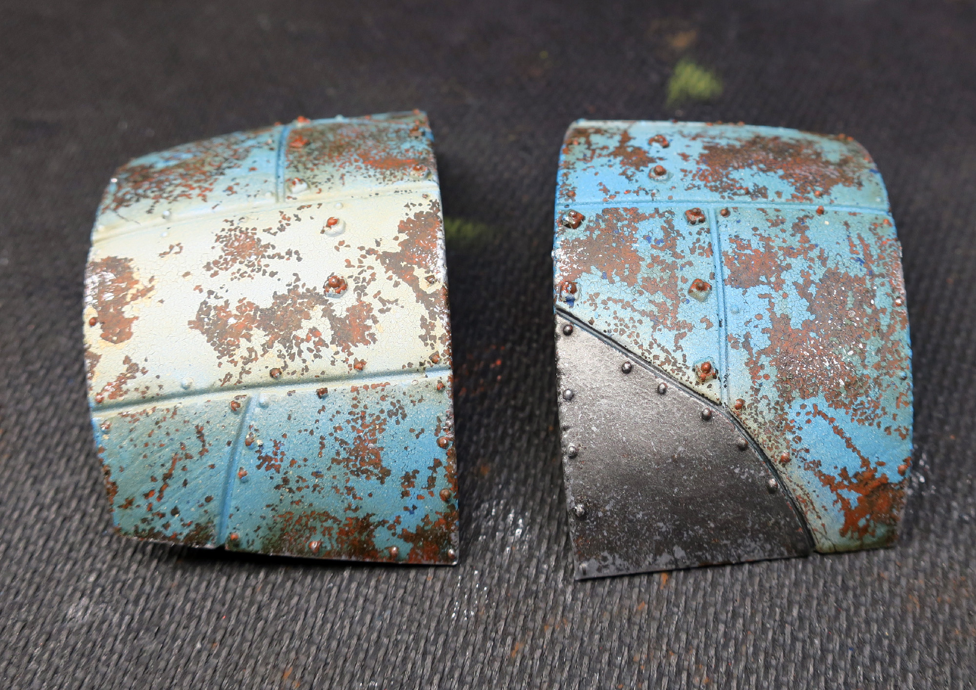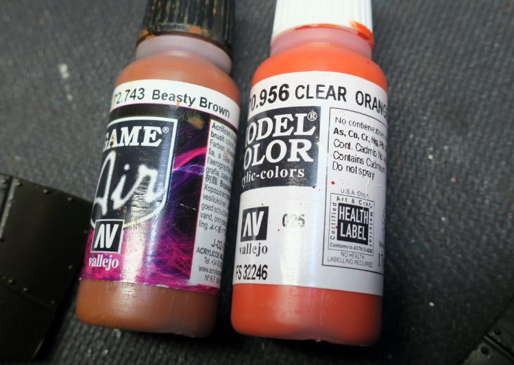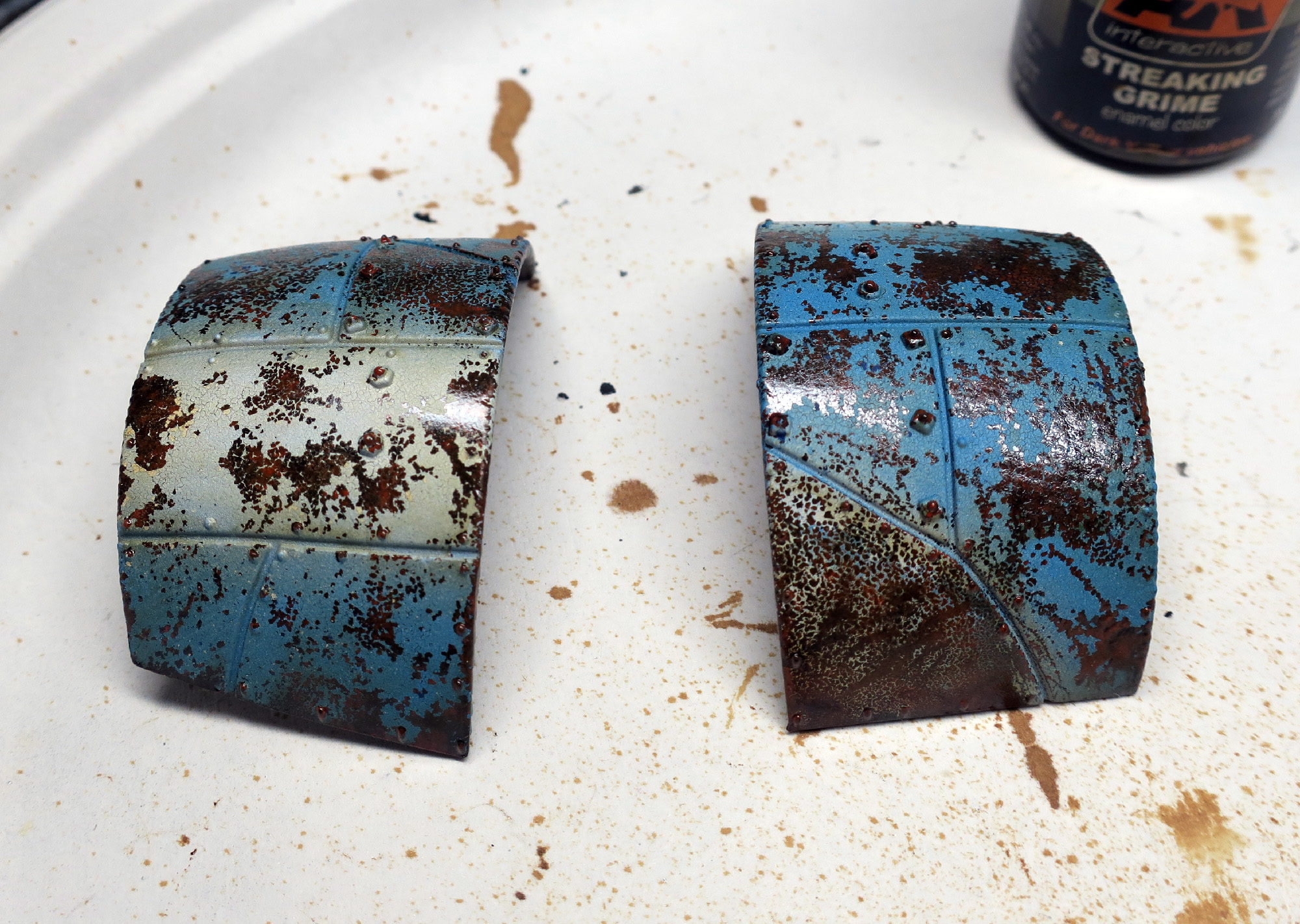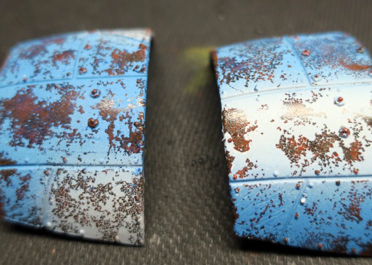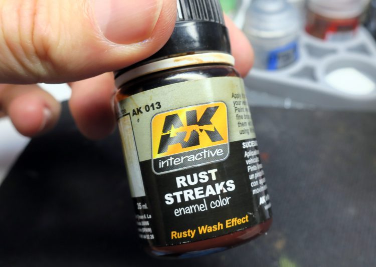 For rust I like using watered down Skrag, no need to get fancy when thinning it either just plan water is fine. I usually push the rust towards the bottom of areas to help create a gradient and make the clean areas really pop.