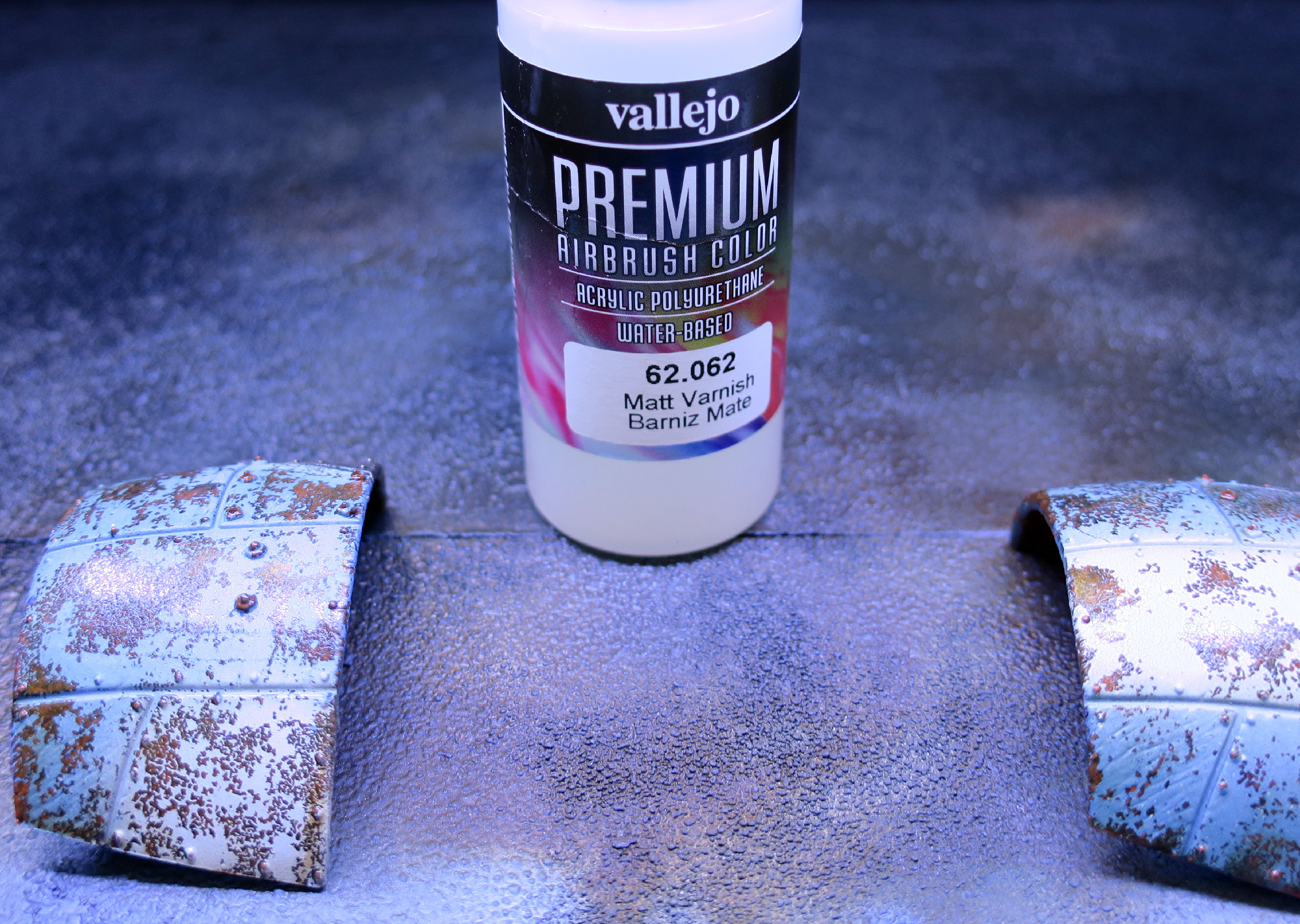This is the magical step, where everything comes together. I use Vallejo Premium Game Color Matte Varnish for this. Just apply with the airbrush, and enjoy the results. It’s magical. I usually have glued all the armor plates on the model at this point, so that the final steps (metallic chips and weathering powders) reflect where the armor plates sit on the model more realistically.