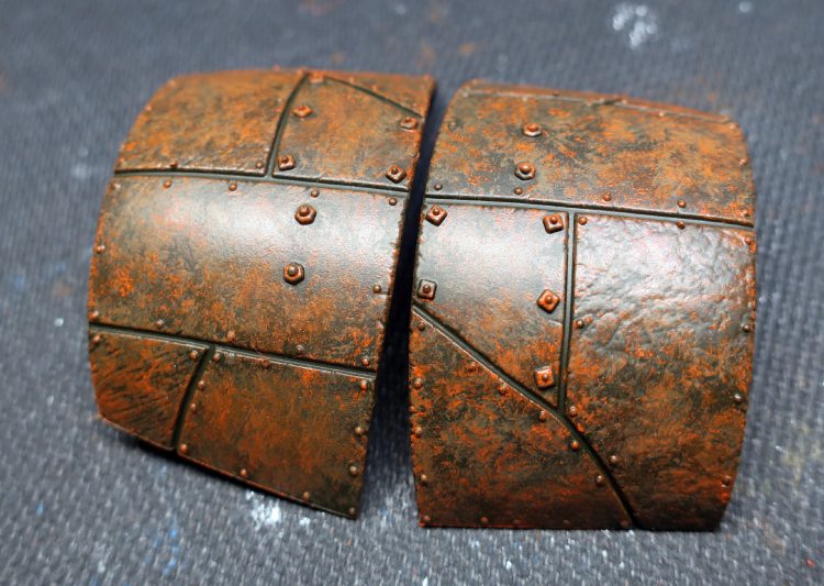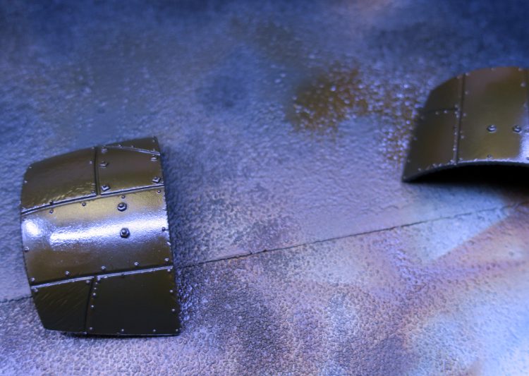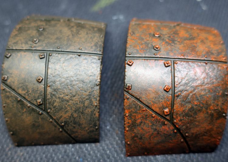 This technique will produce a cool looking effect, followed by an effect you don’t really like, followed by an end result that looks freaking cool. You have to be prepared to feel like you messed up, and still power through to the end. In this example, I’ll be doing two stompa shoulder armor plates to show how different it can turn out on exactly the same piece of kit, and exactly the same technique (even done simultaneously). I recommend duplicating armor plates if this is your first time (I do this almost every time I use this technique, so I can pick my favorite to use)