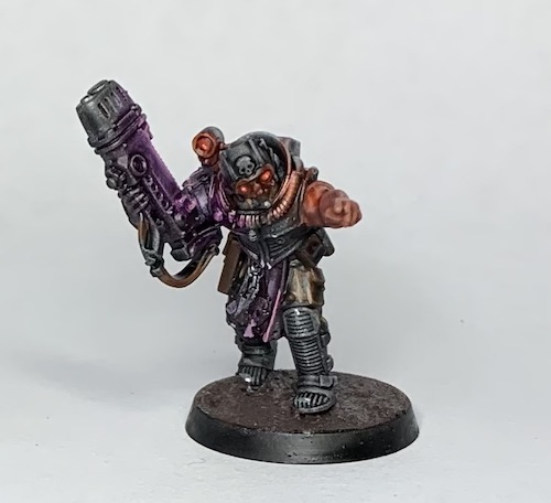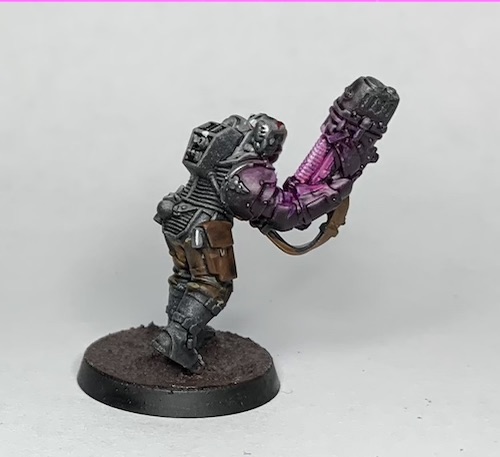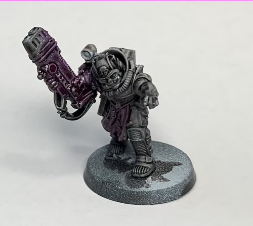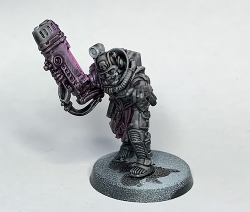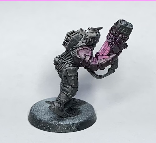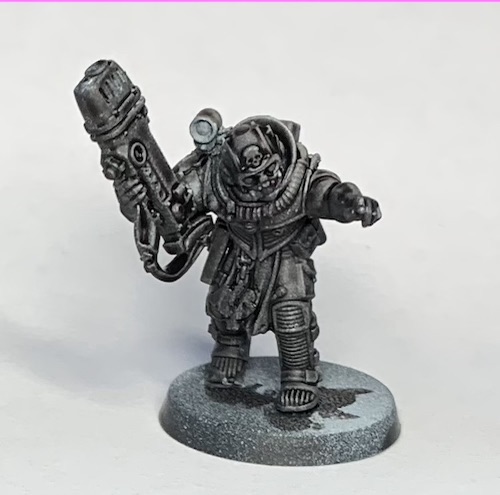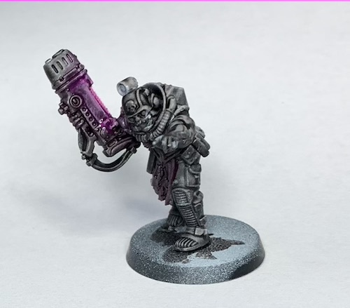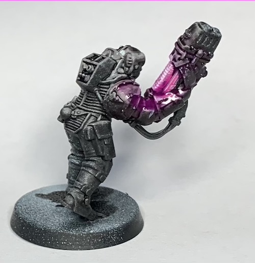 I went with a black->grey zenithally primed guard mini, aiming the lighter colours around where the glow would originate. (This is probably overkill and can be done by drybrushing greys in the area around the glow before step 1).
