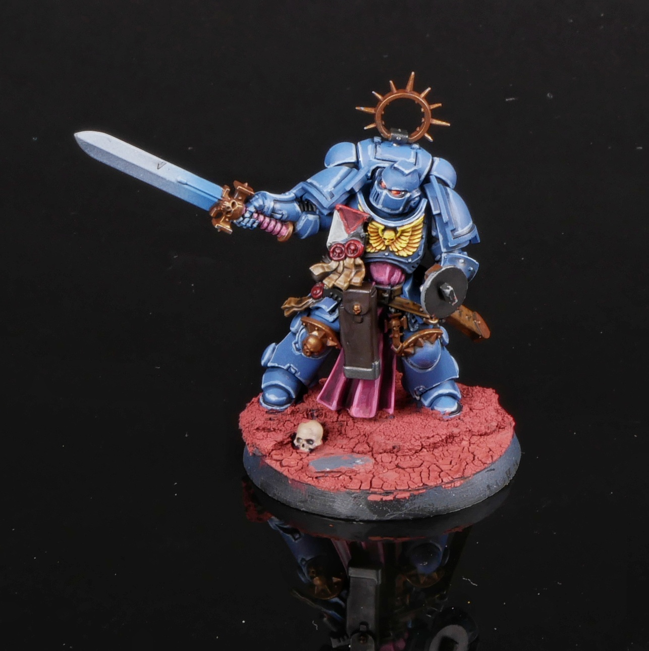 To contrast the blue armor, I usually go with a mauve color for capes, tabards, grips, ropes, and loincloths found throughout the Space Marines range.I start with a basecoat of Pink Horror, washed with Nuln Oil, then relayered with Pink Horror, avoiding the deepest folds and recesses.