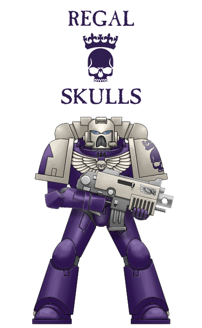 Back in the heyday of the SomethingAwful forums we conducted a “Chapter Challenge” where everyone received a name from a Space Marine Chapter Name Generator along with a color that they had to use. From there everyone had free reign to do whatever they wanted. I received the name “Regal Skulls” and the color purple. After a healthy amount of wasted productivity and thinking I came up with the color scheme below.