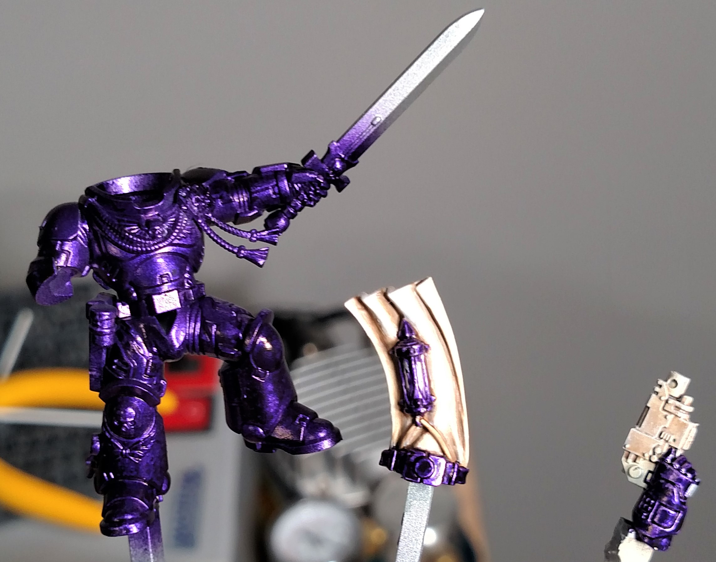 The symbol is simply the 40K skull underneath the “Keep Calm and Carry On” Crown.From there it was a question of translating the image to reality. I knew that I really wanted to experiment with both a variety of colors but also materials, so I decided to combine a metallic purple with a very pale bone. My painting style involves an extensive use of inks and washes to achieve depth, so this approach may not necessarily correlate to the “traditional” Games Workshop system. I encourage you to take what you can from this and make it your own.